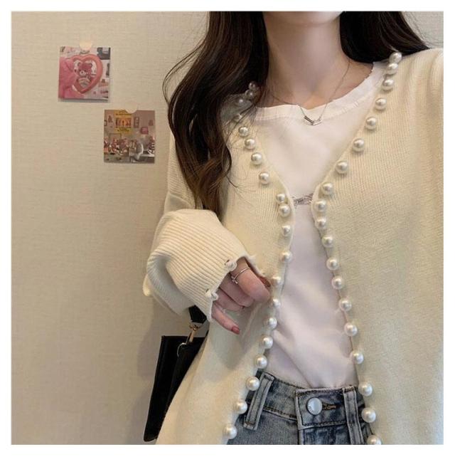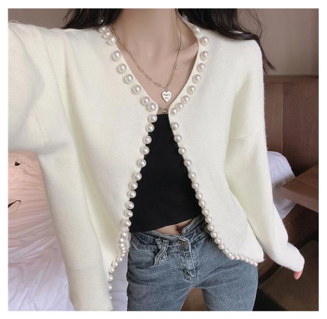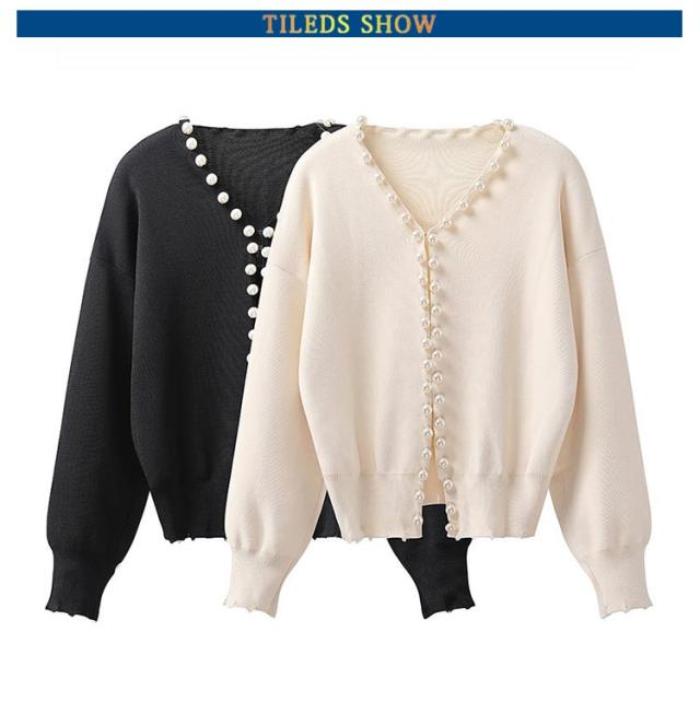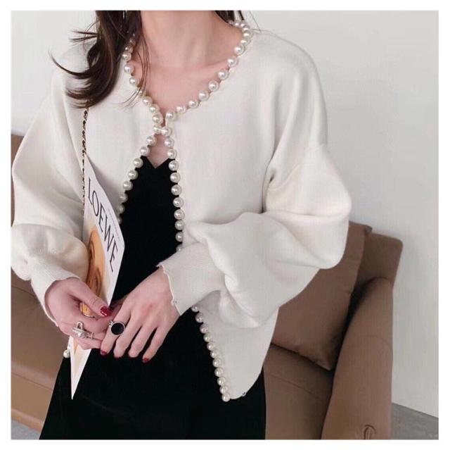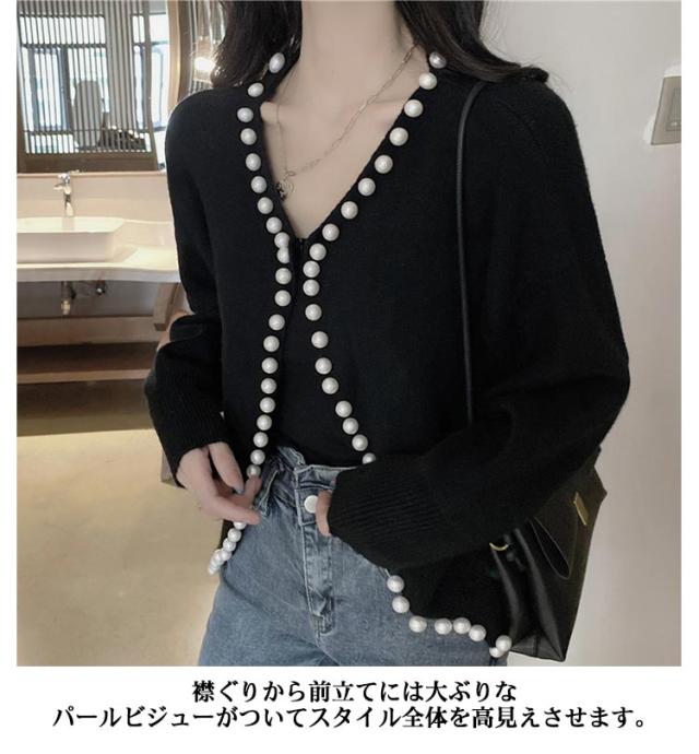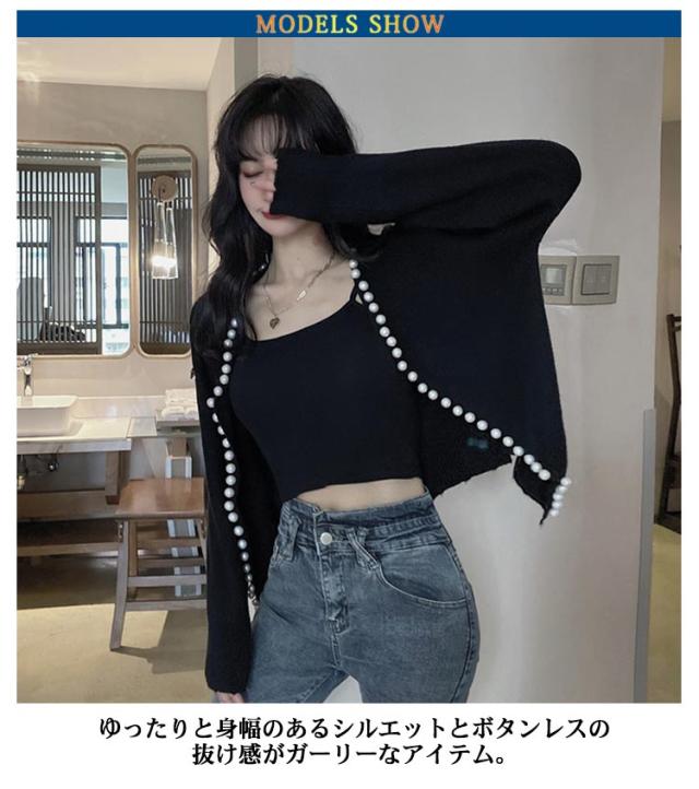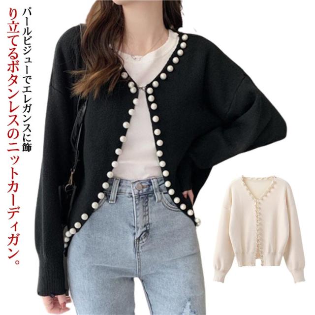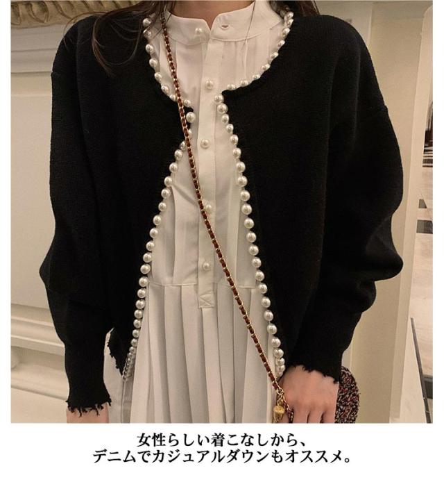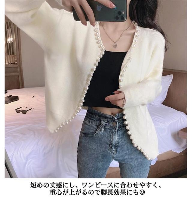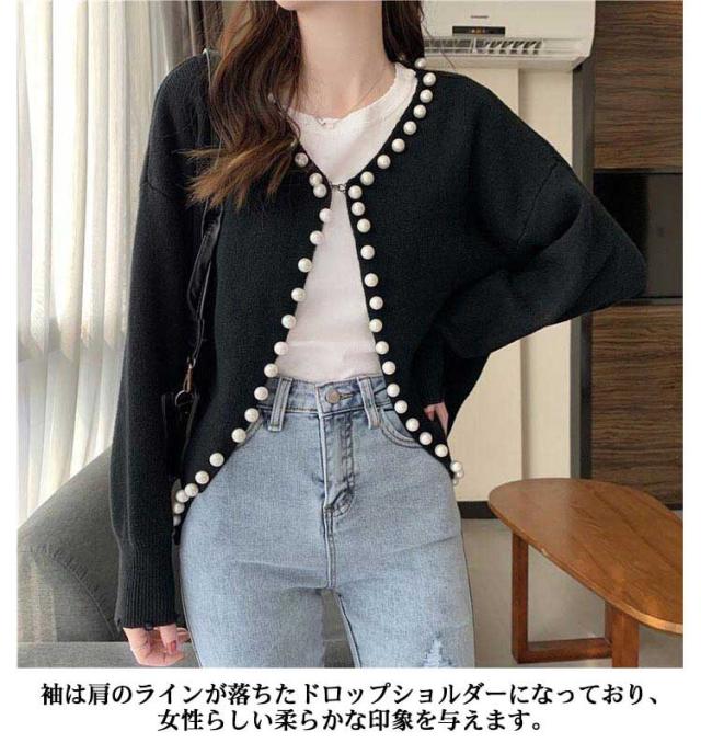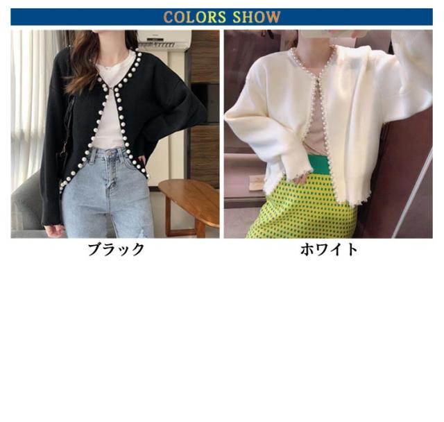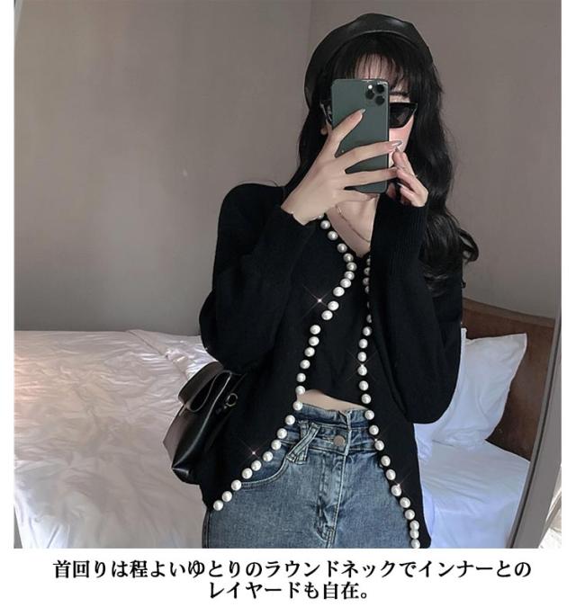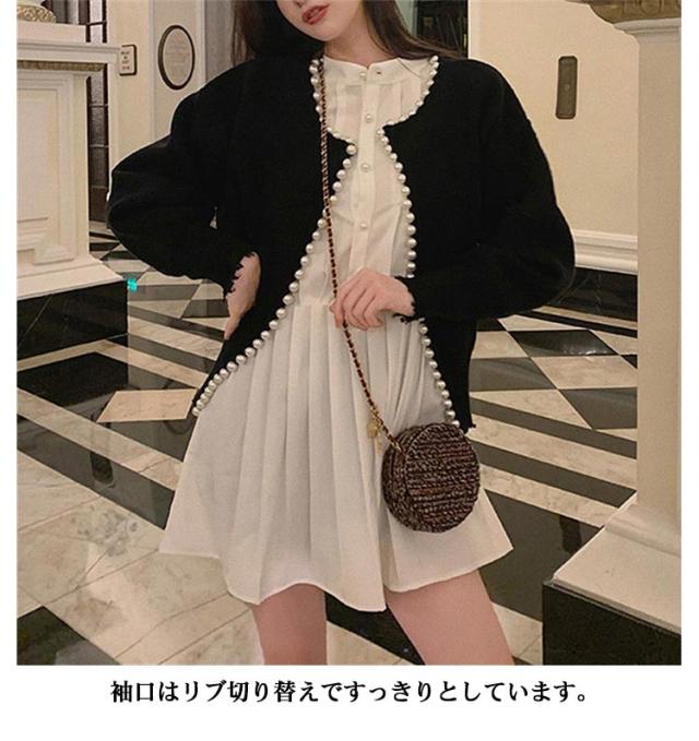 ニットカーディガン レディース カーディガン パールボタン パール付き ニットカーデ バルーンスリーブ ボリューム袖 長袖 ショート丈 クルーネック ニット トップス ゆったり 上品 ブラック ホワイト 黒 きれいめ カジュアル オフィス 春服 秋服 秋冬
