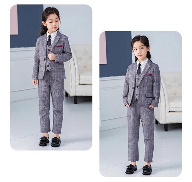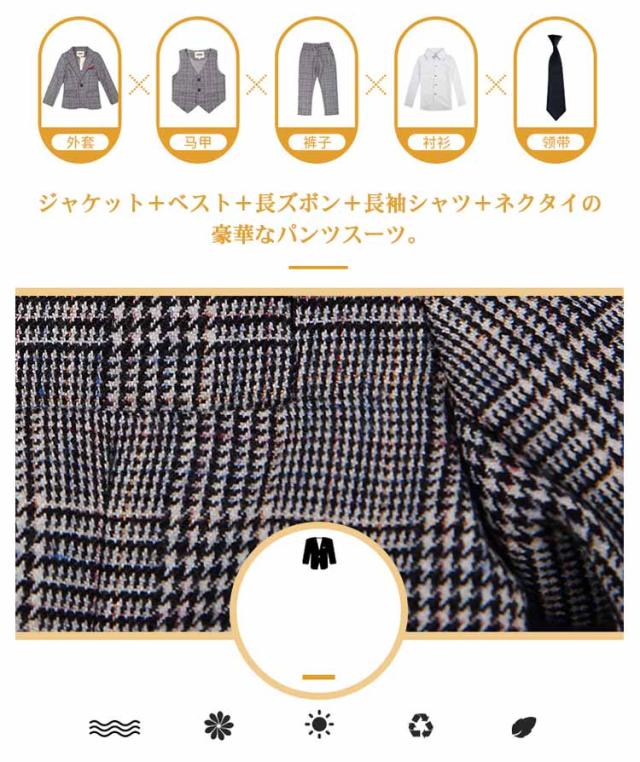 | 豪華な女の子パンツスーツ5点セット。 ジャケット+ベスト+長ズボン+長袖シャツ+ネクタイの豪華なパンツスーツ。 お洒落なグレンチェック柄のスーツ、誰にも似合うグレーをご用意しました。 きちんと感のあるスッキリしたシルエット、装着した瞬間に、かっこいい女の子の姿が見えます。 これ1式で入園式、入学式など大切なしきだけでなく、お食事会やお出かけにも気負いなく着ることができるから、スカートが苦手のお嬢様に大お勧めいたします。 入学式、卒業式、結婚式、七五三、お正月、発表会、誕生日、パーティーなどお子様の晴れの舞台にぜひお使い下さいませ。 ウェストはゴムなので、脱ぎ履きラクラク。 | |