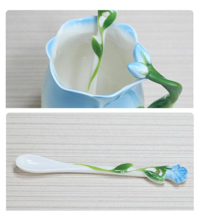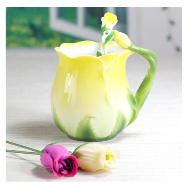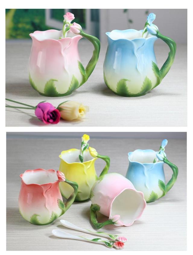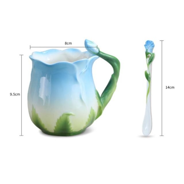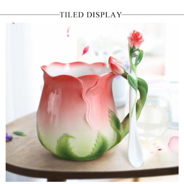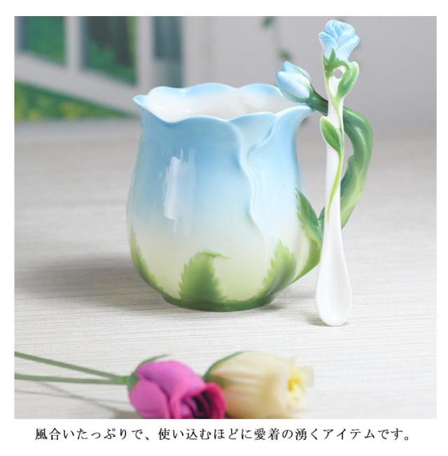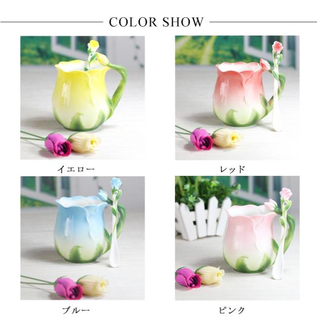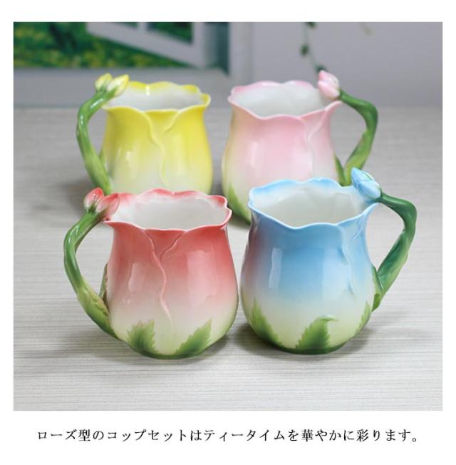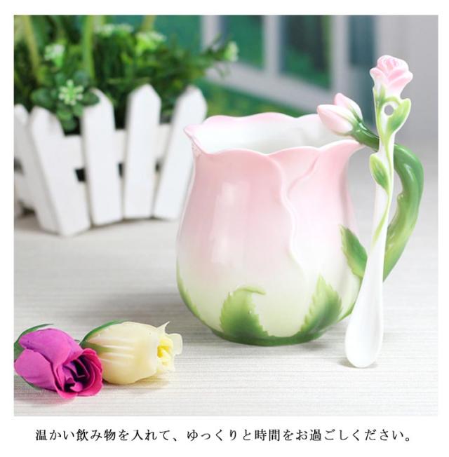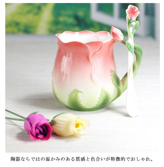 陶器 マグカップ 320ml 耐熱 花型 彫刻 ローズ 型 カップ 取手付き スプーン付き 湯呑み 花柄 花模様 華奢 セラミック ティーカップ コーヒー お茶 マグカップ 母の日 プレゼント ギフト 華やか レッド ピンク