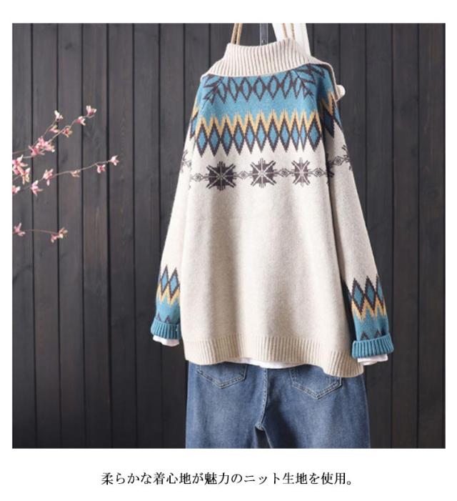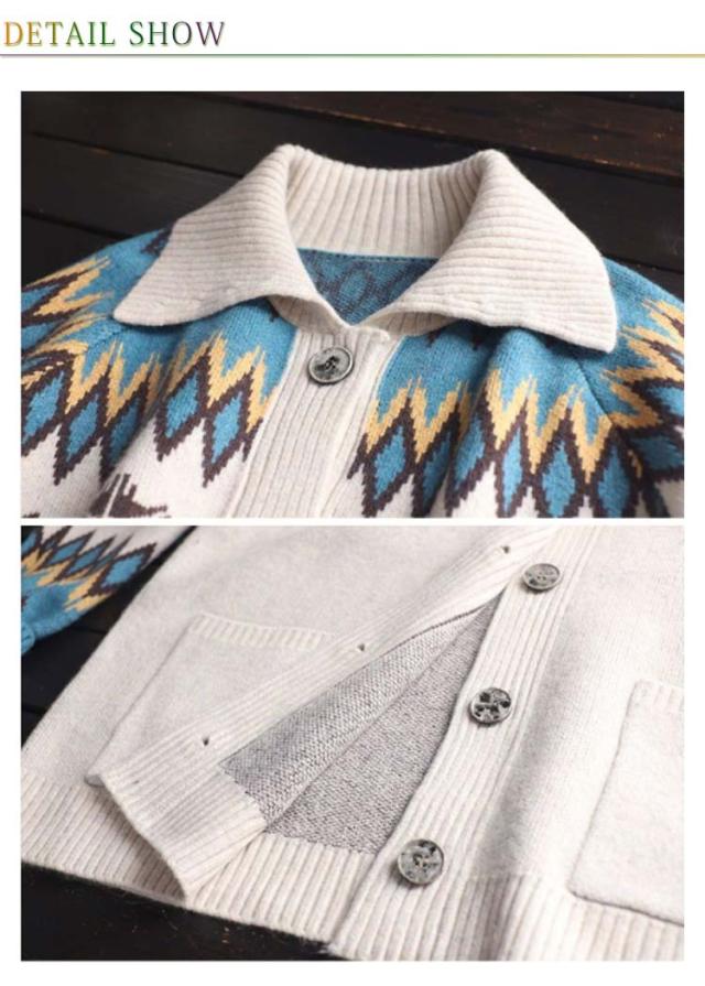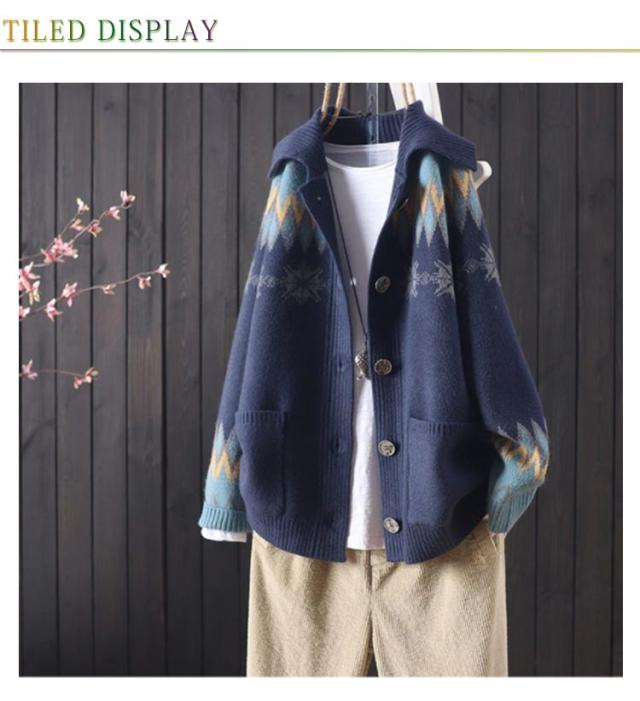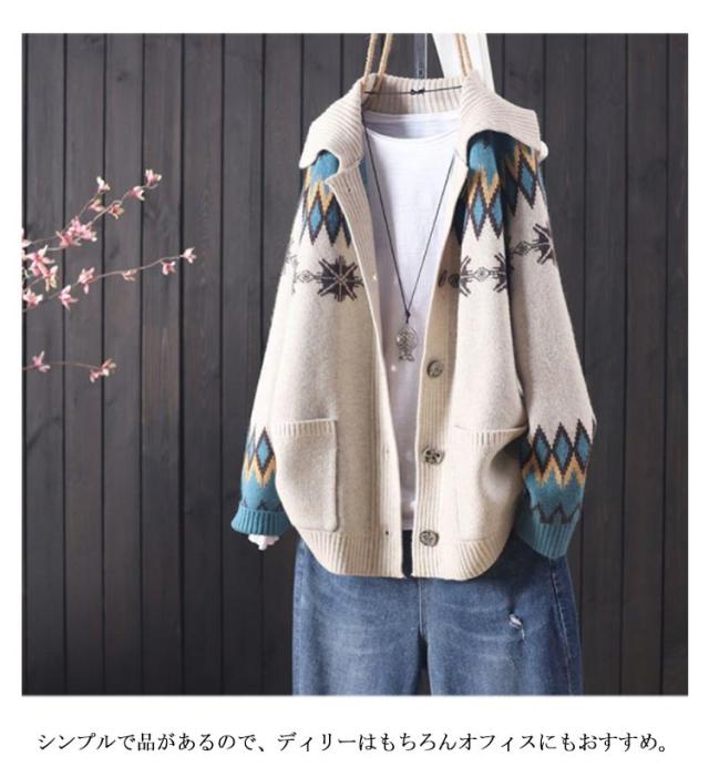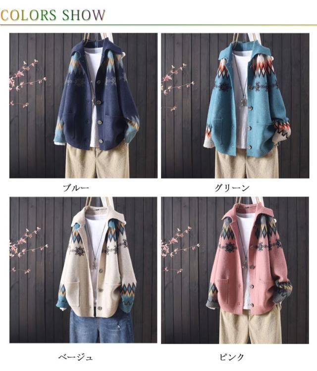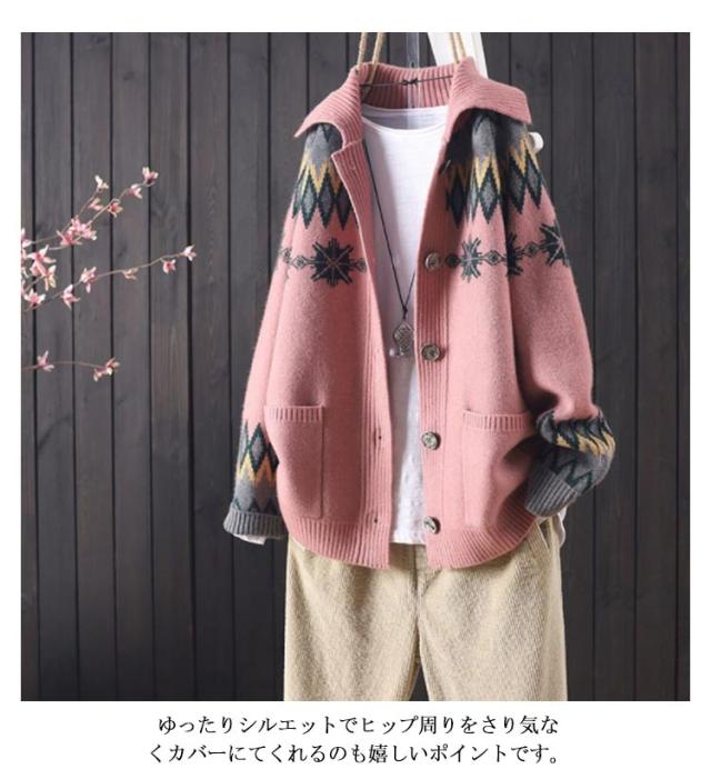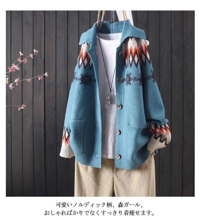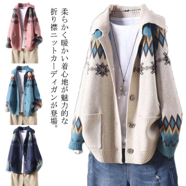 折り襟カーディガン 前開き エスニック柄 ニットカーディガン ニット 長袖 体型カバー ボタン付き ゆったり 着痩せ スウィート レディース ざっくり ノルディック柄 トップス 厚手 シンプル ニット カジュアル アウター 森ガール カーデ 大きいサイズ 暖かい 送料無料