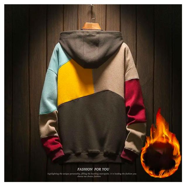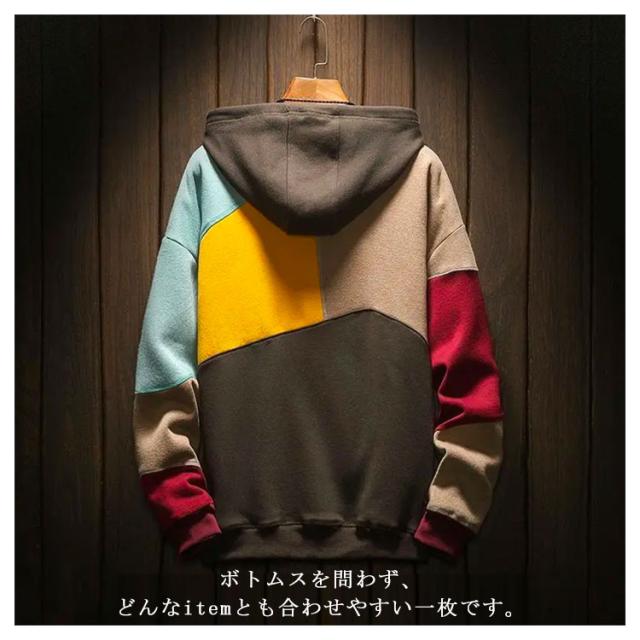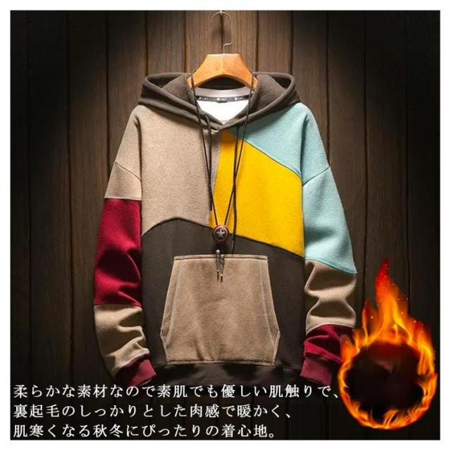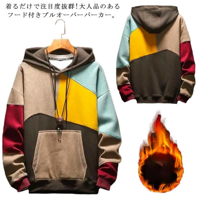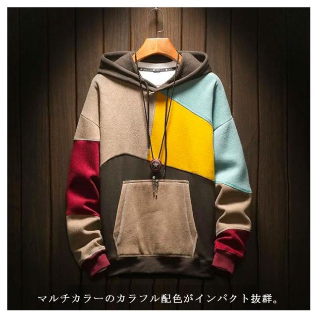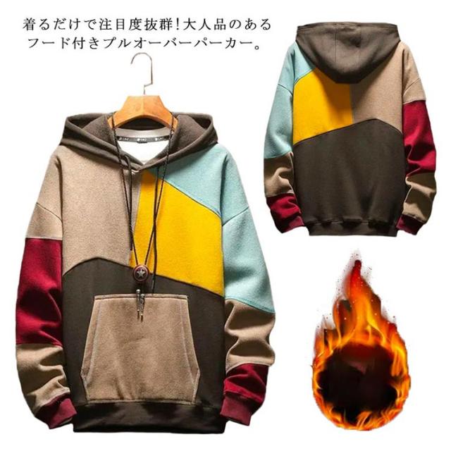 春服 メンズパーカー 配色 カラフル パーカー マルチカラーパーカー 裏起毛 フード付き プルオーバーパーカー トップス 秋服 大きサイズ おしゃれ 秋冬 送料無料