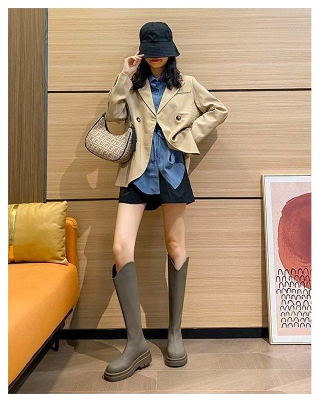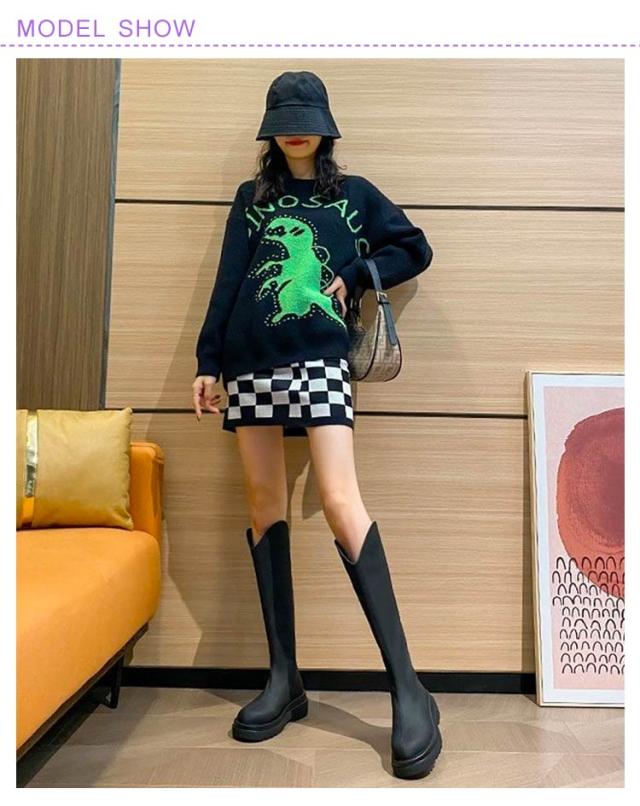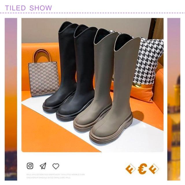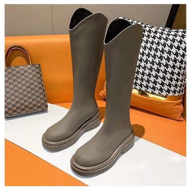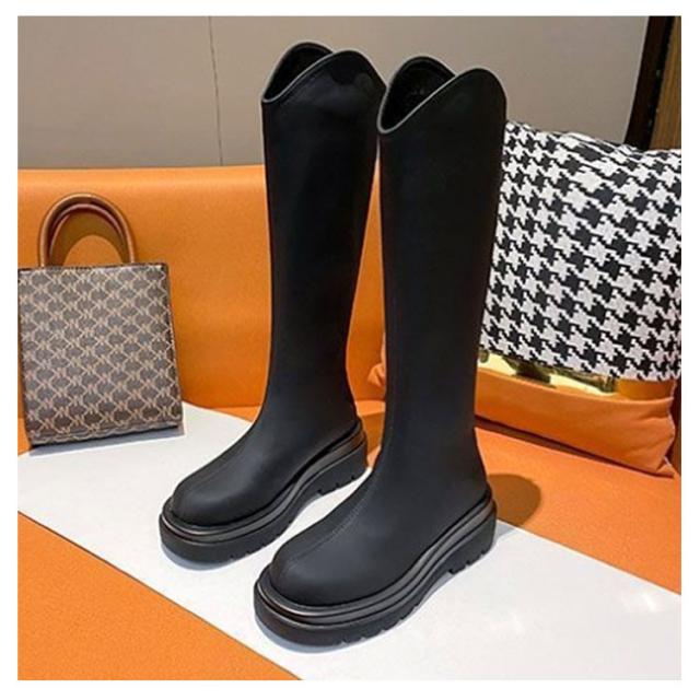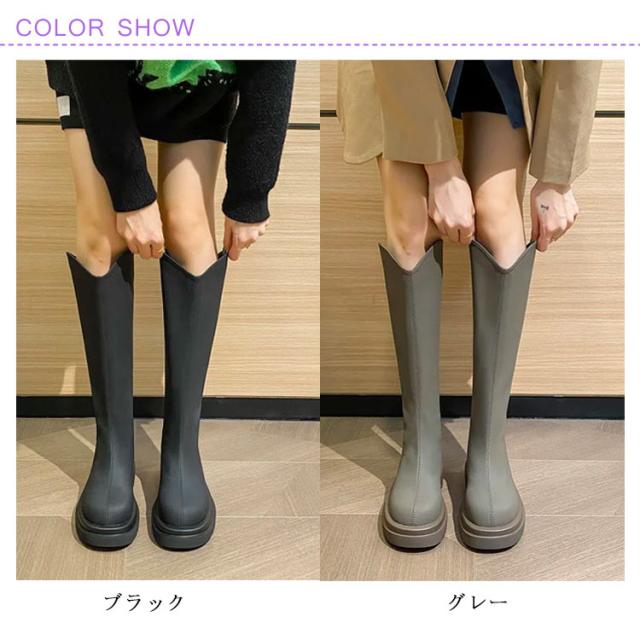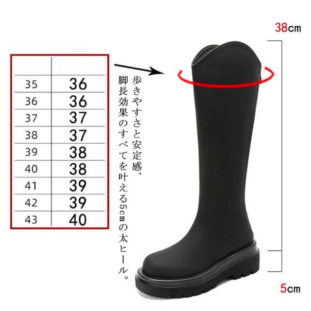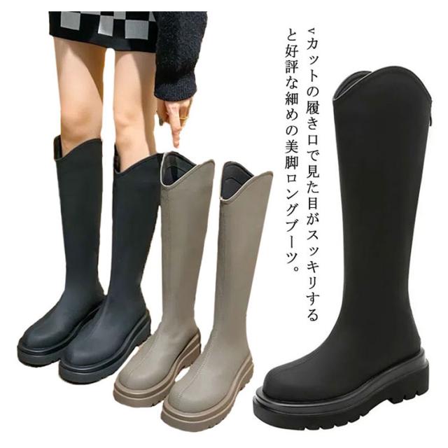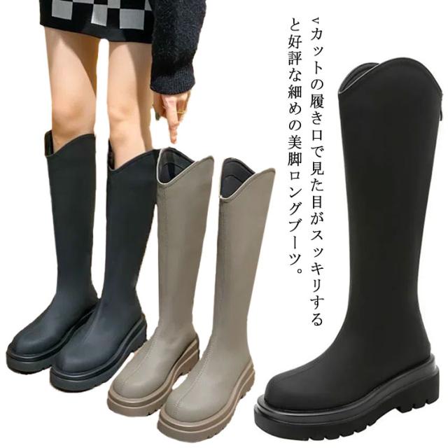 ロングブーツ Vカット Vカットブーツ ロング丈 ロング丈 ブーツ 5cmの太ヒール 身長アップ 美脚 バックジップ 春秋 フェイクレザー 滑り止め オフィス カジュアル 太め 厚底 ロングブーツ フラットシューズ