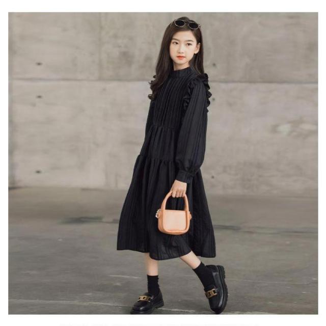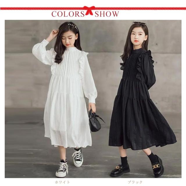 女の子 ワンピース 長袖 フォーマル ブラック ホワイト 肩フリル付き 子供服 ジュニア 春秋 子ども カジュアル キッズ ガールズ 普段着 お出かけ デート 入学式 通学 結婚式 発表会 パーティー お祝い 冠婚葬祭 120 130 140 150 160 165 お誕生日 プレゼント