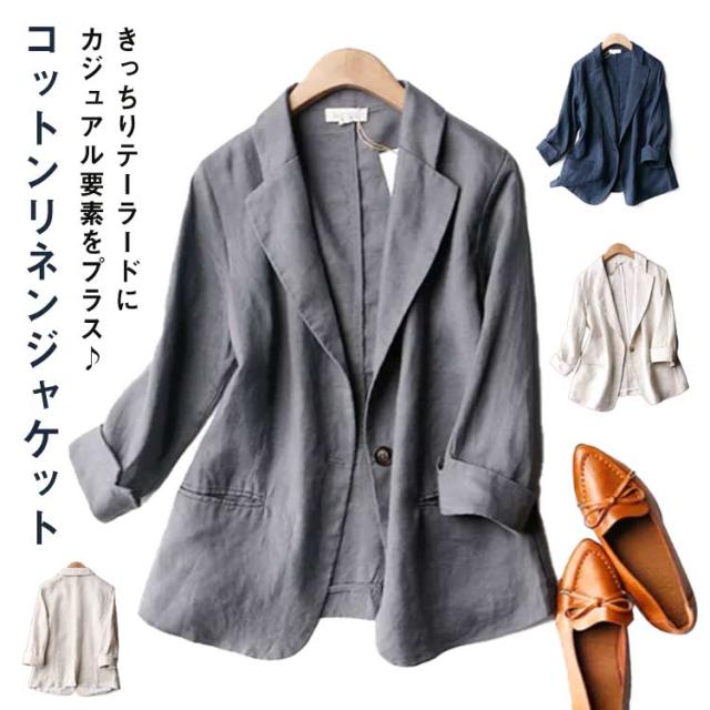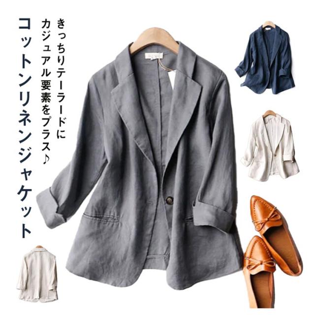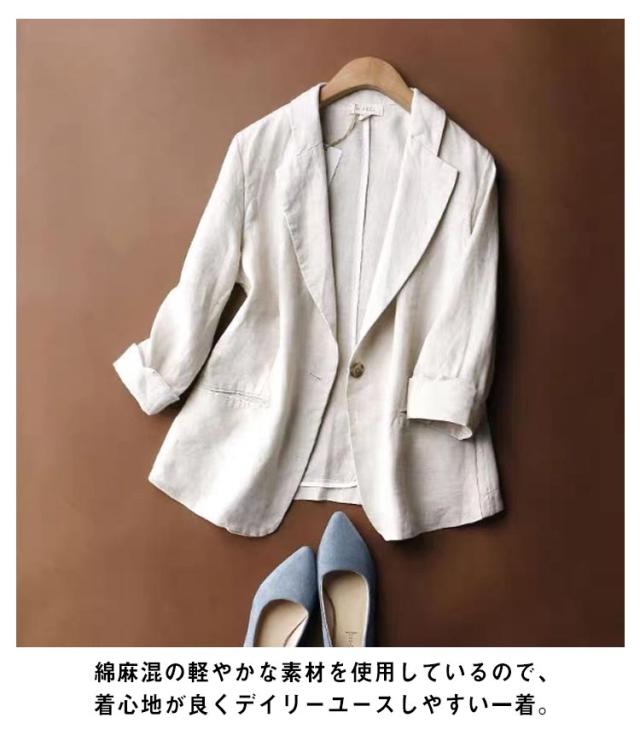 テーラードジャケット レディース リネンジャケット サマー ジャケット 7分袖 羽織り 1つボタン スリムスーツ 春アウター 綿混 リネン オフィス カジュアル 洗える 春 夏 無地 全3色