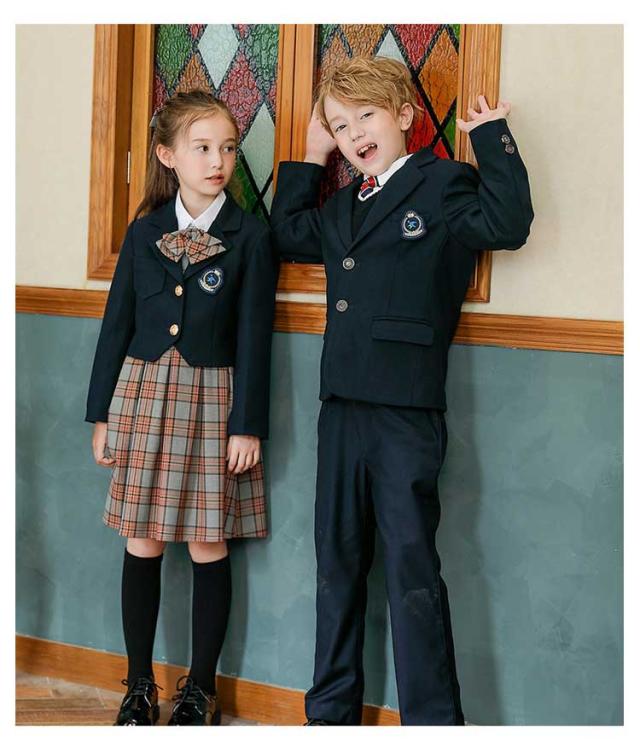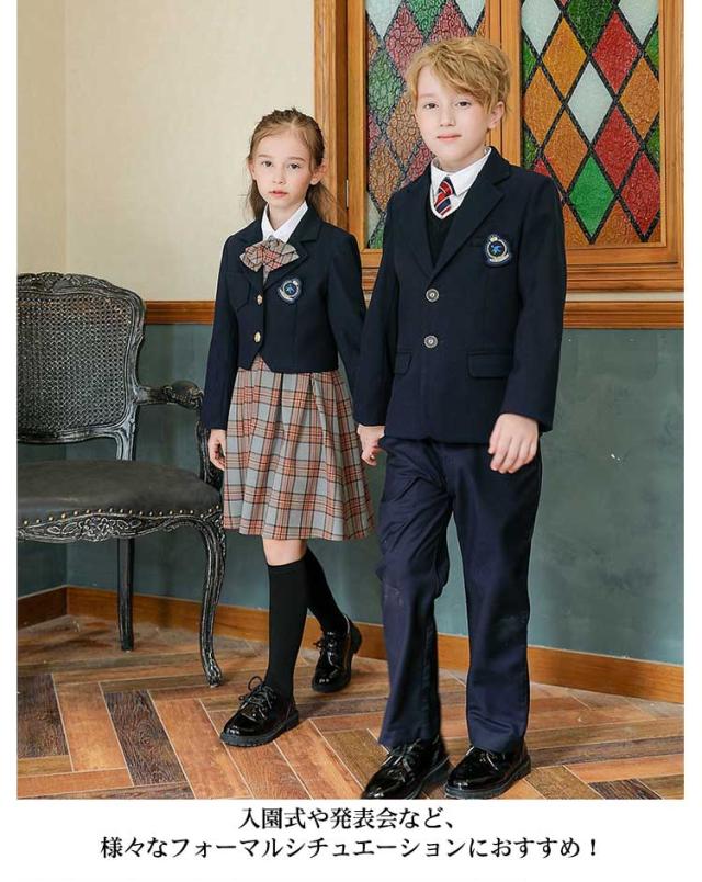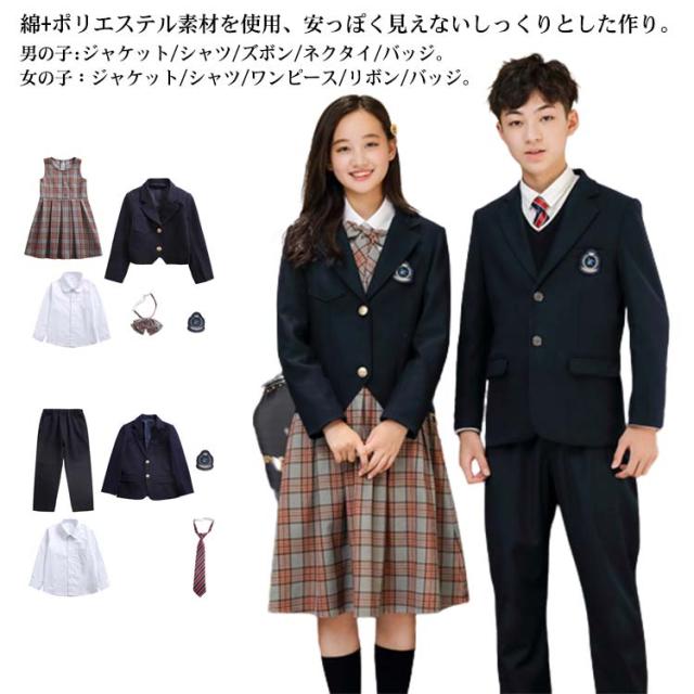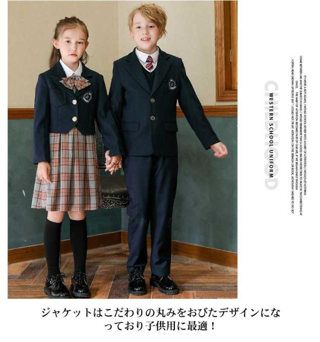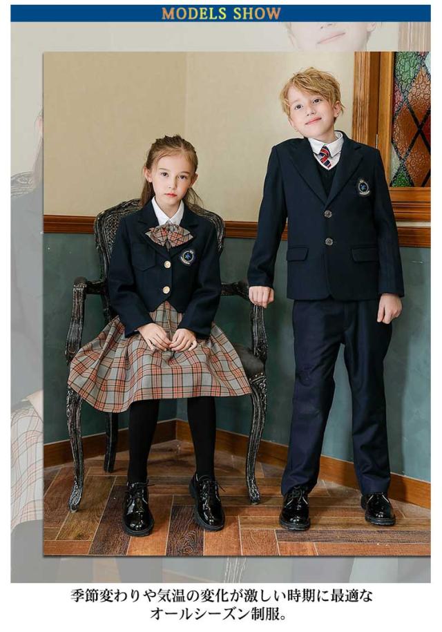 | 男の子:ジャケット/シャツ/ズボン/ネクタイ/バッジ。 女の子:ジャケット/シャツ/ワンピース/リボン/バッジ。 綿+ポリエステル素材を使用、安っぽく見えないしっくりとした作り。 季節変わりや気温の変化が激しい時期に最適なオールシーズン制服。 幅広い身長や体重範囲の子供に適応するイギリス風制服セット。 入園式や発表会など、様々なフォーマルシチュエーションにおすすめ! ジャケットはこだわりの丸みをおびたデザインになっており子供用に最適! ワンピース:着用便利な背中ファスナー仕様!一人でも着用可能な楽々デザイン。スカートは可愛いチェック柄。 | |
