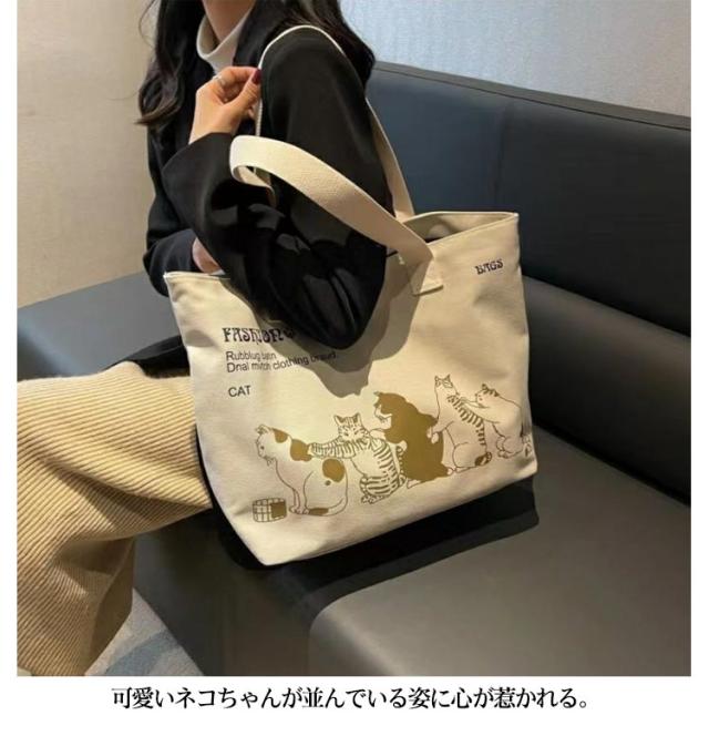 春物新作 帆布 トートバッグ キャンバス バッグ A4 ファスナー付き エコバッグ レッスンバッグ 軽量 大容量 送料無料 猫 カバン 布 通学 体操バッグ 部活 通学 ネコ