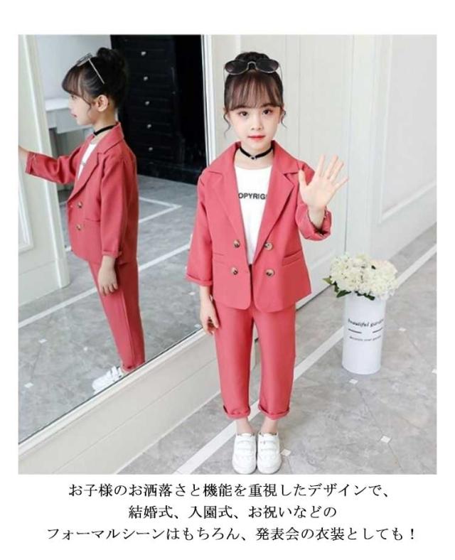 送料無料 子供服 フォーマル スーツ 女の子 2点セット ジャケット パンツ カジュアルスーツ パンツスーツ 入学式 卒業式 ジュニア パンツスーツ キッズ 七五三 発表会 結婚式 卒園式 入園式 子ども セットアップ 春 ゆったり