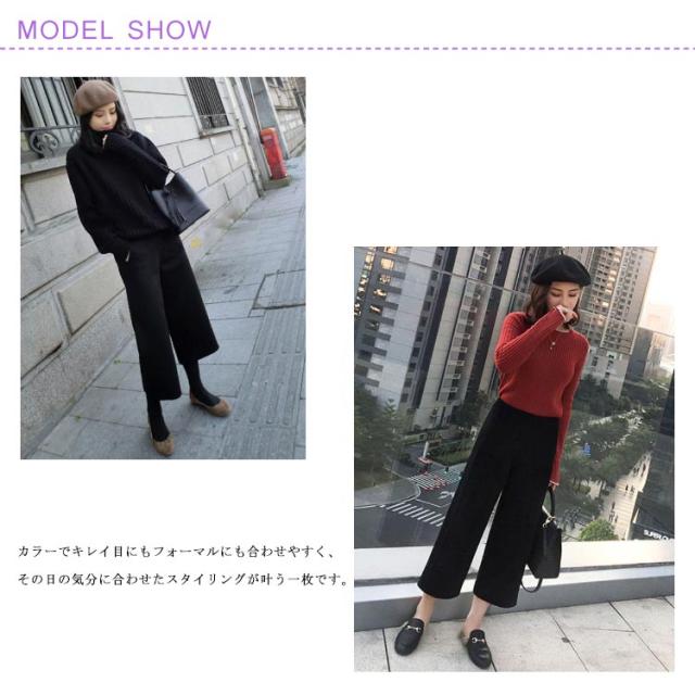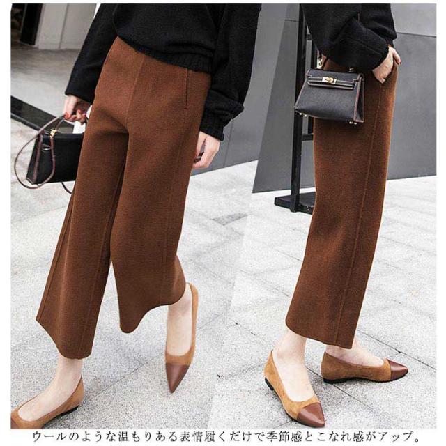 ワイドパンツ 厚手 定番 9分丈 ボトムス エストゴム 春 秋冬 ガウチョ ハイウエスト パンツ アンクルパンツ クロップド丈 体型カバー 無地 オフィス 楽ちん あったか 仕事 長ズボン