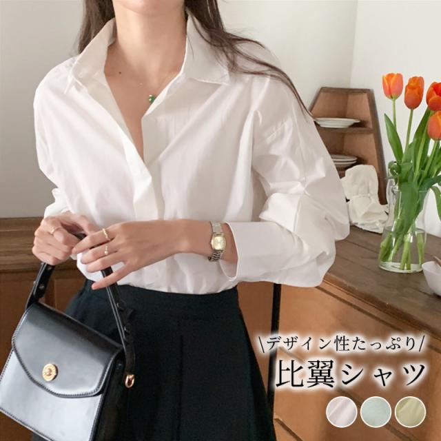 春新作 比翼 シャツ ブラウス レディース 長袖 無地 おしゃれ かわいい オーバーサイズ ドロップショルダー フライフロント オフィス きれいめ 春秋 トップス 白 薄手 シンプル レギュラーカラー ミディアム丈 プリーツ袖 ボックスプリーツ