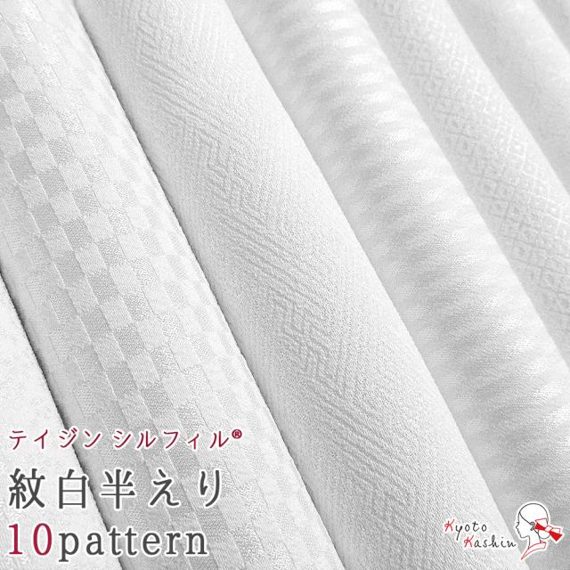 【4枚までメール便送料無料】シルフィル 紋えり 白半衿 洗濯OK 白 半衿 地紋 10柄 テイジン 襟 帝人 ポリエステル 和柄 無地 市松 縞 七宝 麻の葉 立枠 沙綾型 唐草 鹿の子 小花 吹雪 着物 和装 振袖 訪問着 色無地 附下 袷 単衣 留袖 袷 単衣 襦袢 カジュアル