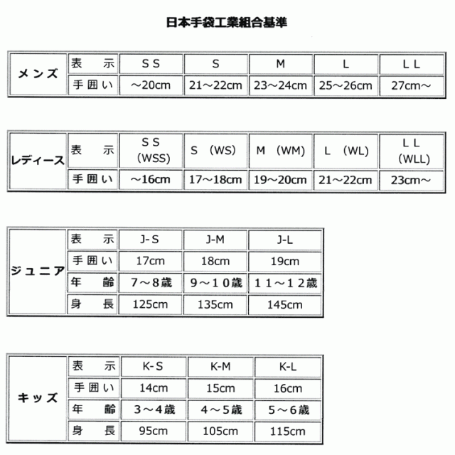 下記の日本手袋工業組合基準を参考にしてください。