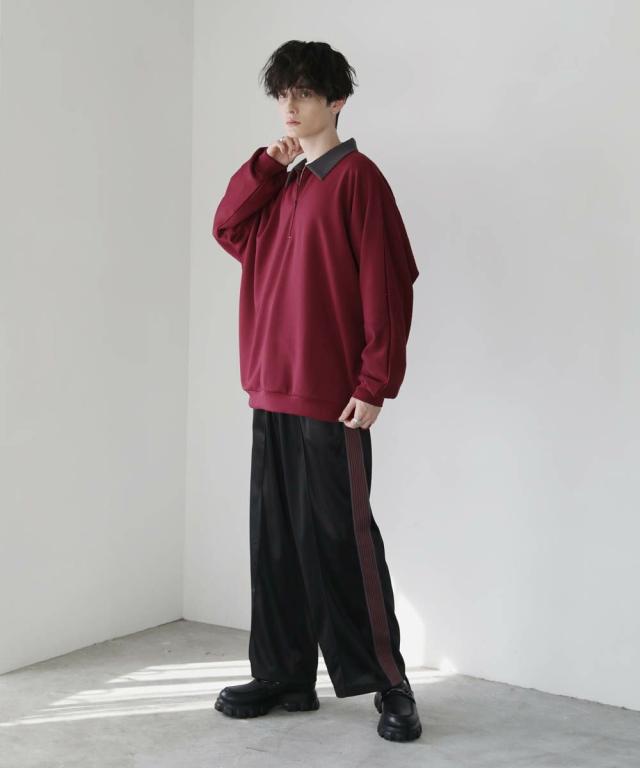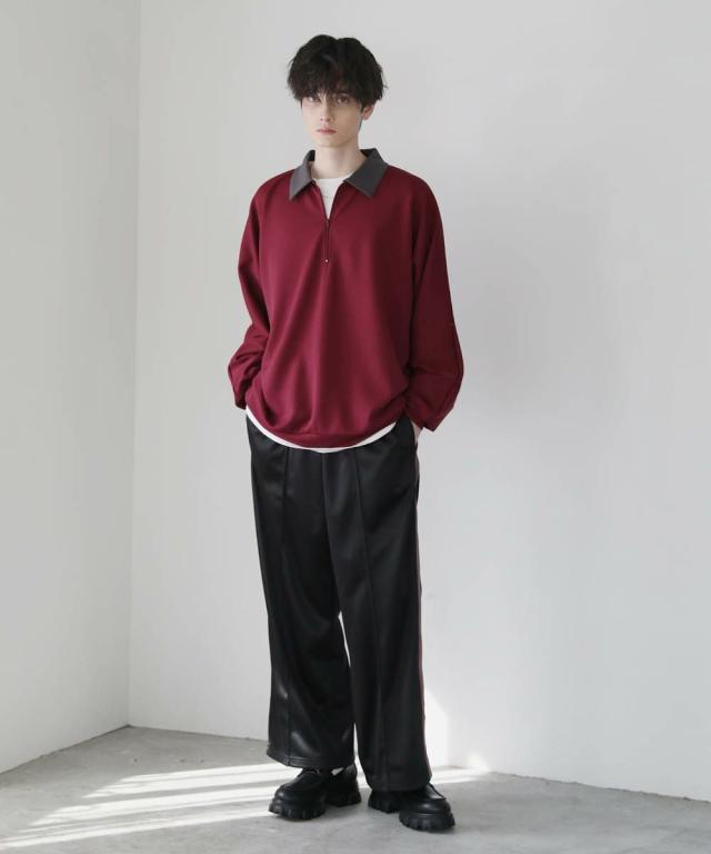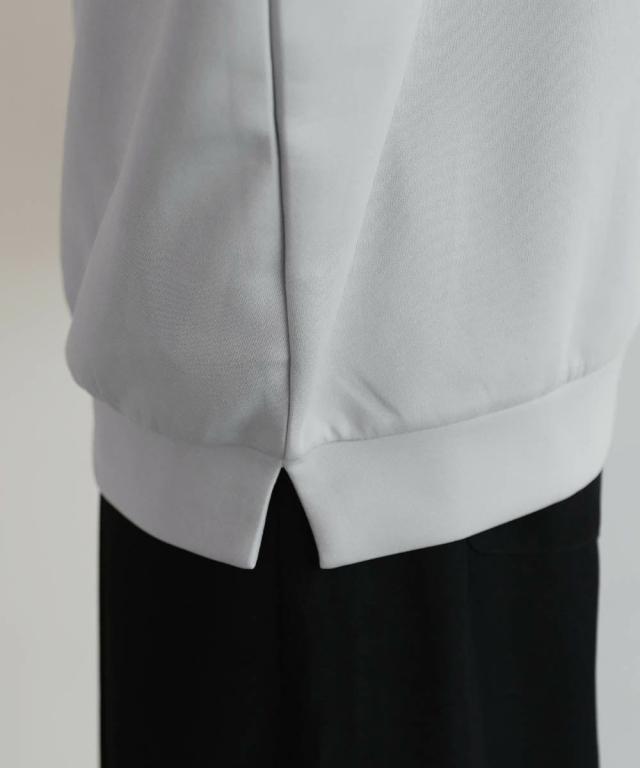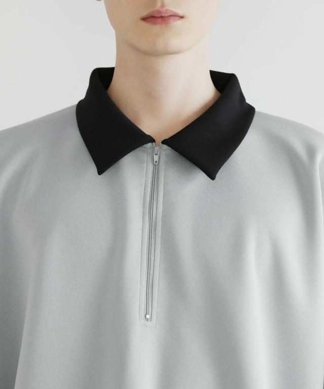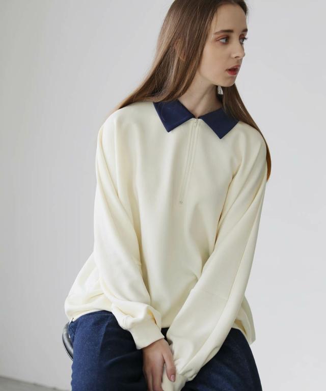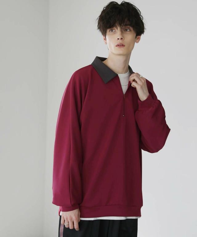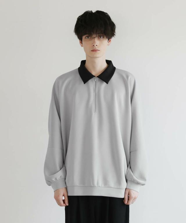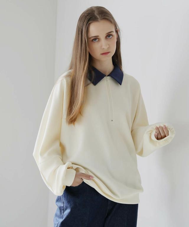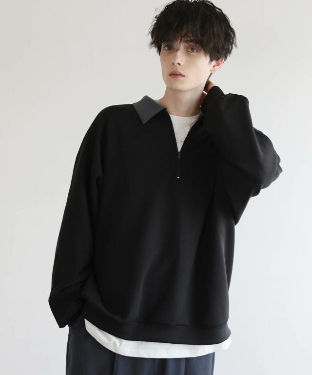 リラックス感のあるオーバーサイズのハーフジッププルオーバー。配色切り替えになった襟がアクセントになり、1枚で着こなしが決まるアイテム。ドルマンスリーブ&ワイドな袖が抜け感のある立体的なシルエットに見せてくれます。程よく肉厚&伸縮性のあるポンチ素材を採用し、ロングシーズン着用できる1枚。ほんのりと光沢感があり、シンプルなアイテムながら1枚で上品でキレイめな印象を与えてくれます。