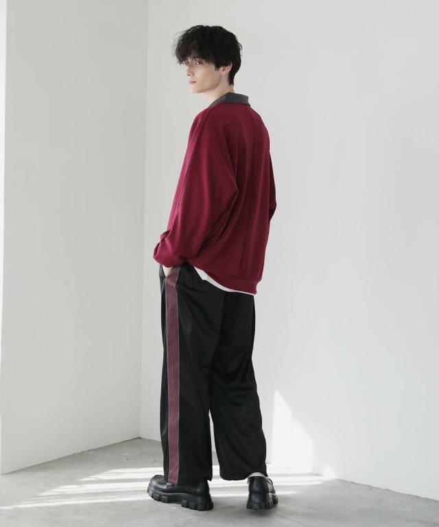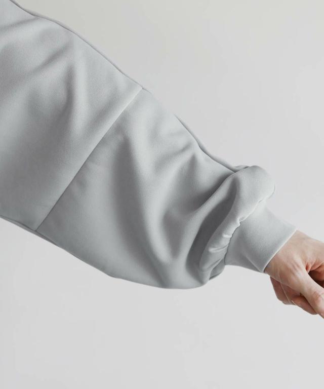 伸縮性のある柔らかなポンチ素材を使用しています。軽い着心地で動きやすく快適な着心地。程よい光沢感と艶感がありキレイめな雰囲気で着用いただけます。
