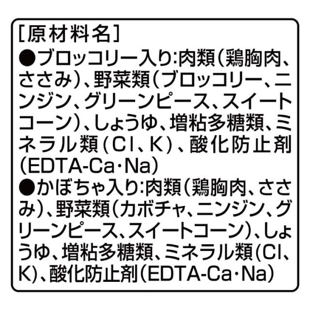| ★ブロッコリー入り 肉類(鶏胸肉、ささみ)、野菜類(ブロッコリー、ニンジン、グリーンピース、スイートコーン)、しょうゆ、増粘多糖類、ミネラル類(Cl、K)、酸化防止剤(EDTA-Ca・Na) ★かぼちゃ入り 肉類(鶏胸肉、ささみ)、野菜類(カボチャ、ニンジン、グリーンピース、スイートコーン)、しょうゆ、増粘多糖類、ミネラル類(Cl、K)、酸化防止剤(EDTA-Ca・Na) |