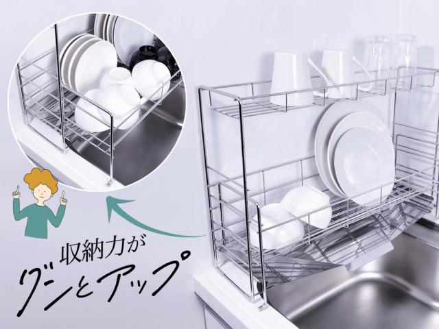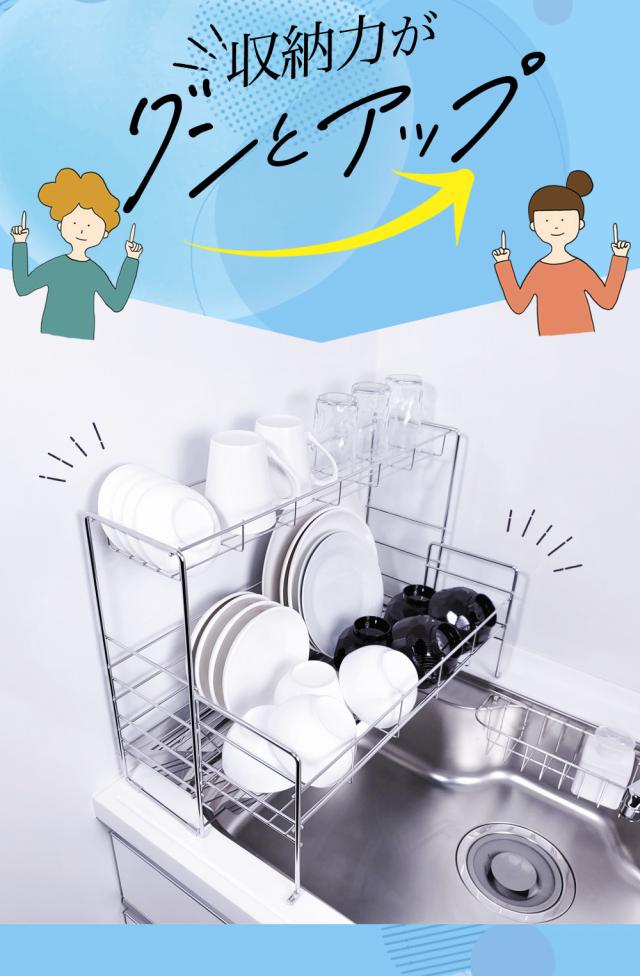 - 幅が広く5人分の食器を置いても十分な容量があるので、ストレスなく洗い物ができます。2段になっていることで、コップを重ねず置け、乾くのが早いです。お皿を立てて置けるので、水はけもよいです。とても気に入っ...