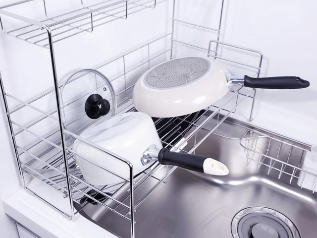 食器の洗い物は大家族分でも収納できる大きさです。調理後のフライパンや鍋蓋は、ラックを最大に広げればらくらく収納!