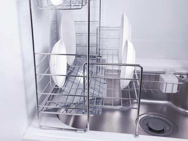 食後の食器は量に合わせてカゴを伸縮させて水切り乾燥。