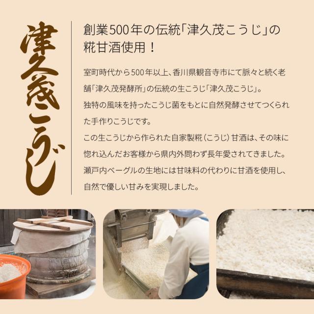 500年以上の歴史がある観音寺市の老舗「津久茂発酵所」の生こうじで作った自家製糀(こうじ)甘酒を使用し、もっちり歯切れのよいベーグルが完成しました。甘酒の自然で優しい甘みが特徴です。