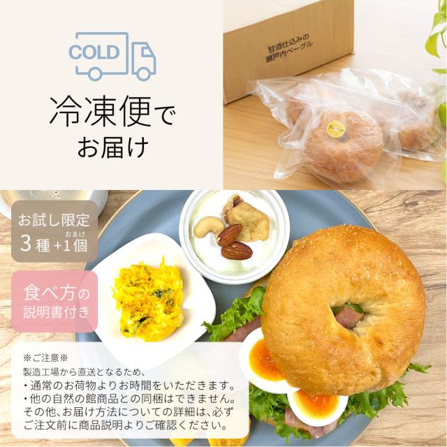 甘酒ベーグルお試しセット 3個+1個おまけ 送料無料 ベーグル 冷凍便 甘酒 パン 非常食 お試し