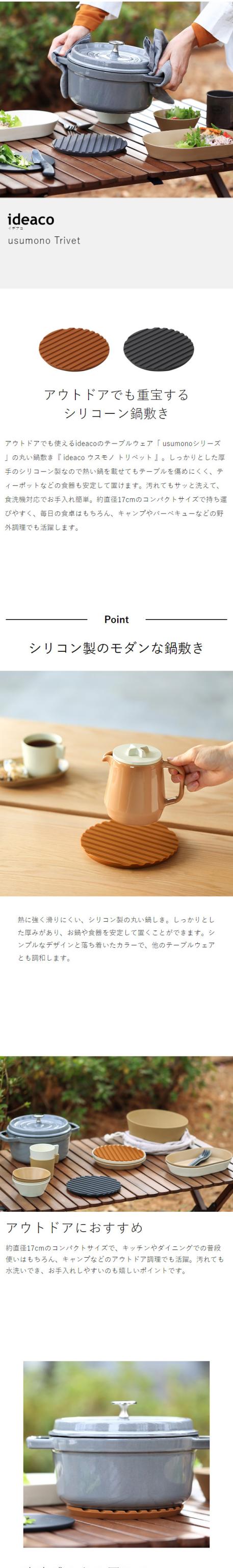 アウトドアでも重宝する シリコーン鍋敷き アウトドアでも使えるideacoのテーブルウェア「 usumonoシリーズ 」の丸い鍋敷き『 ideaco ウスモノ トリベット 』。しっかりとした厚手のシリコーン製なので熱い鍋を載せてもテーブルを傷めにくく、ティーポットなどの食器も安定して置けます。汚れてもサッと洗えて、食洗機対応でお手入れ簡単。約直径17cmのコンパクトサイズで持ち運びやすく、毎日の食卓はもちろん、キャンプやバーベキューなどの野外調理でも活躍します。