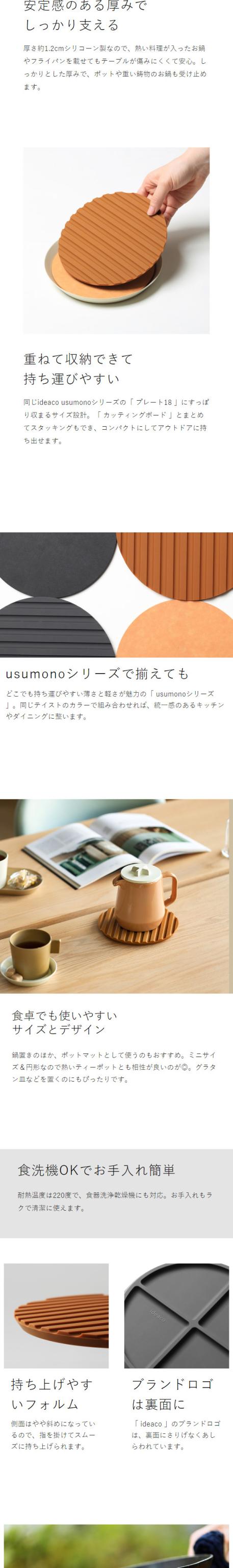 usumonoシリーズの円形鍋敷き。厚いシリコン製の鍋しきなのでテーブルや鍋を傷めにくく、食洗機対応でお手入れ簡単。コンパクトなのでBBQやキャンプ飯等のアウトドア調理にもおすすめ。