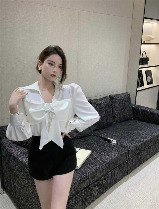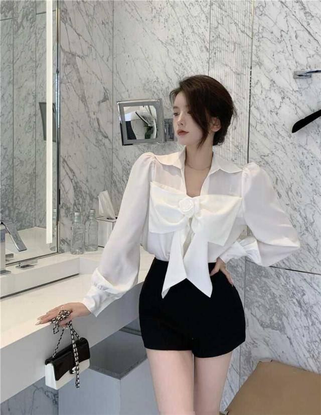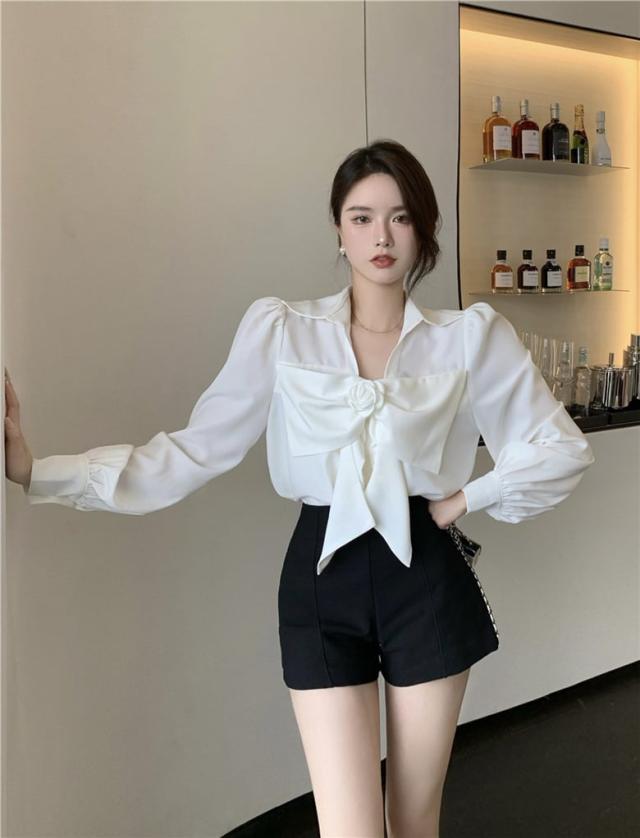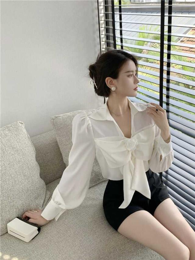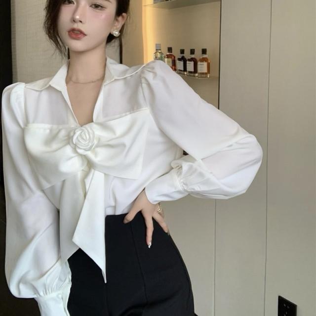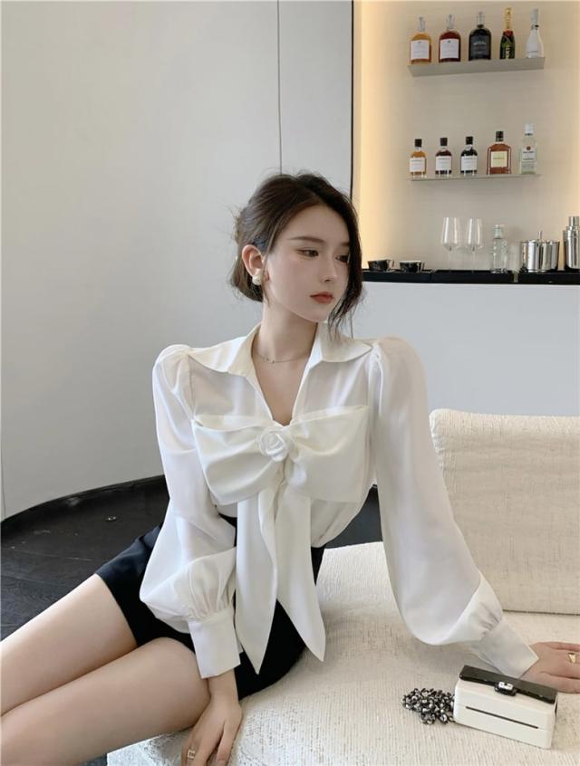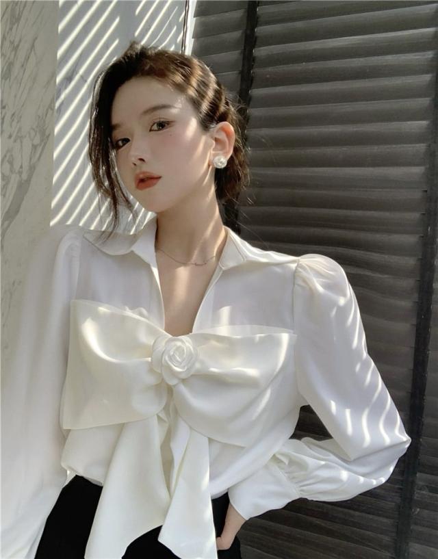 花びらのようなデザインのついたフロントのリボンが印象的なブラウス。