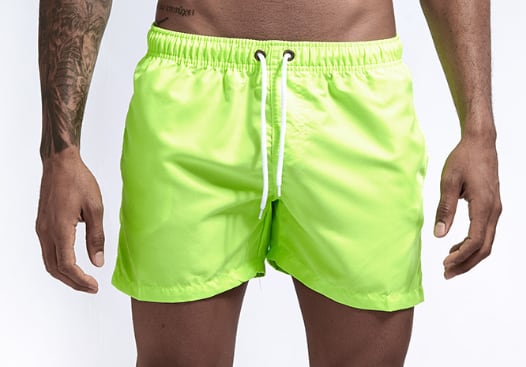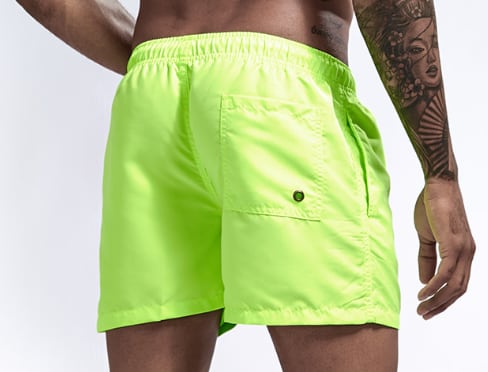 オーソドックスな形ながらトレンドの蛍光色、ワイドシルエットの男性用ハーフパンツ水着です。