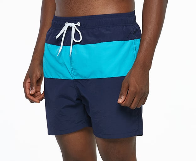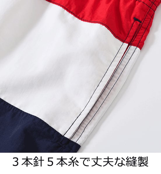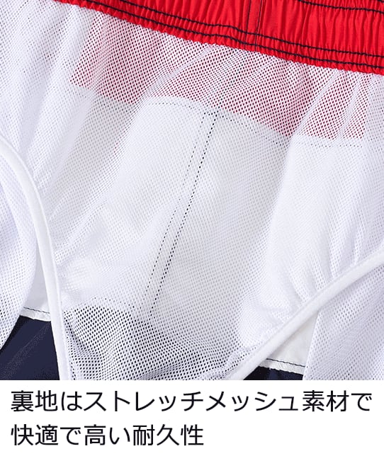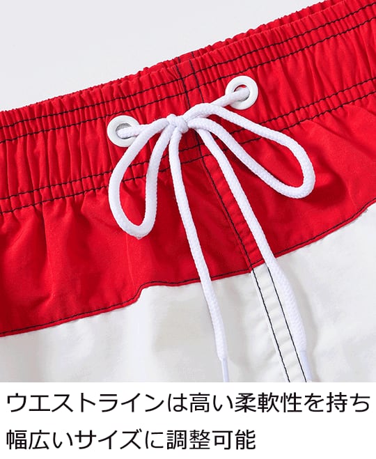 オーソドックスな形ながらトレンドのワイドシルエットの男性用ハーフパンツ水着です。
