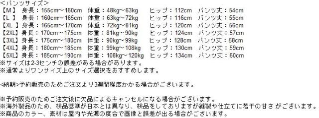 【5XL】身長:185cm〜190cm 体重:108kg〜120kg ヒップ:134cm パンツ丈:60cm