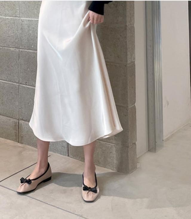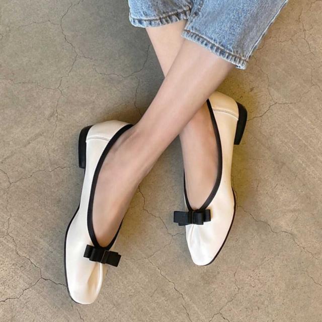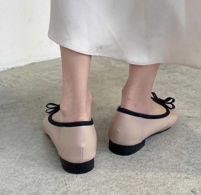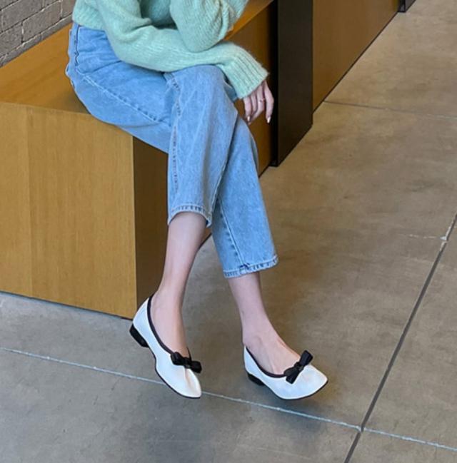 バイカラーのリボンがフェミニンでカジュアルコーデにぴったりな靴。