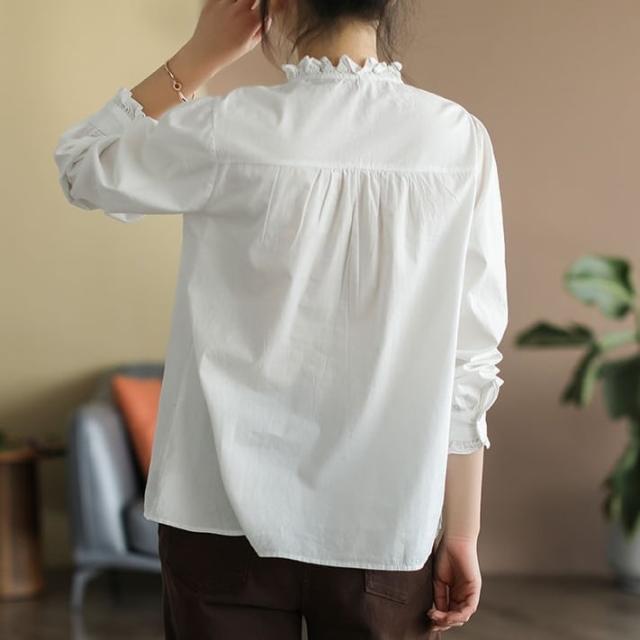 フリル襟がさり気ない愛らしさで、袖にも小さなフリルをあしらった抜かりないデザイン。