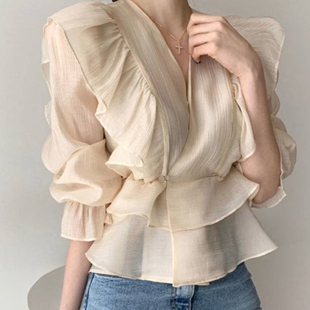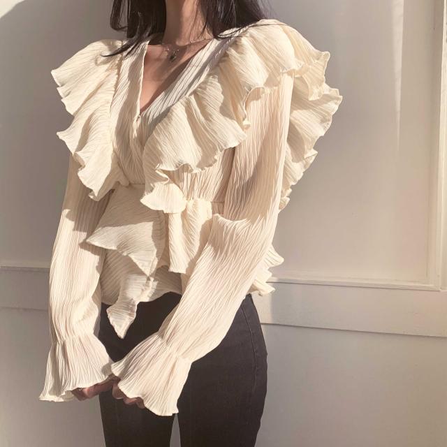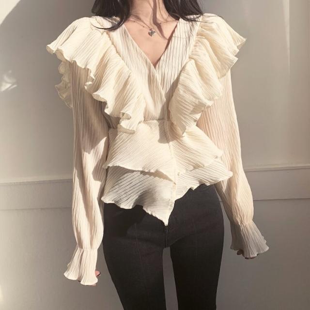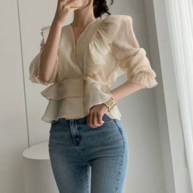 トップス レディース シャツ ブラウス 袖あり 長袖 襟なし 透け感 フリル しわ加工 ウエストマーク ハイウエスト Vネック ペプラム 大人可愛い きれいめ シンプル カジュアル 大人 上品