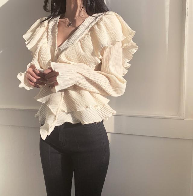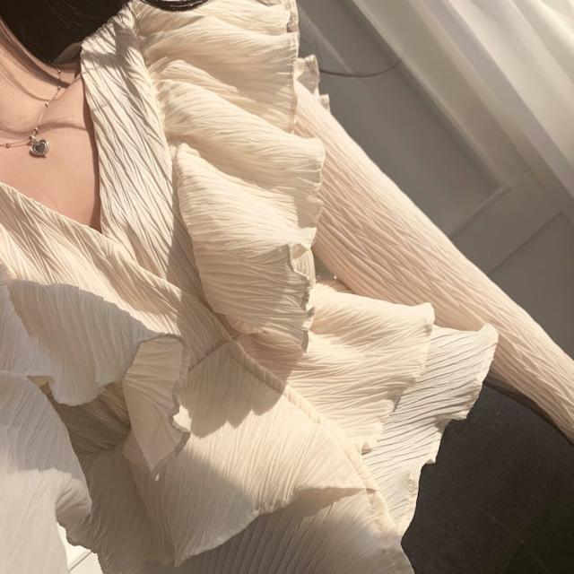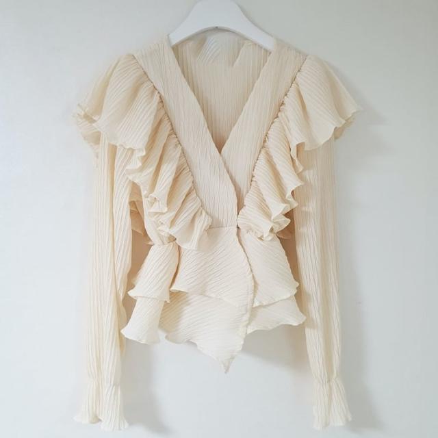 しわ加工入りのニュアンス生地がフェミニンなカシュクールブラウスです。