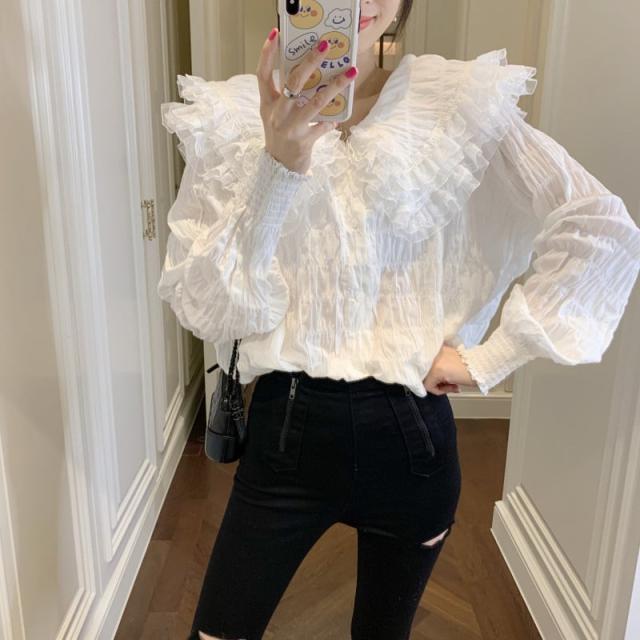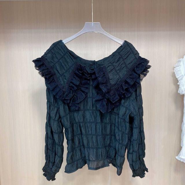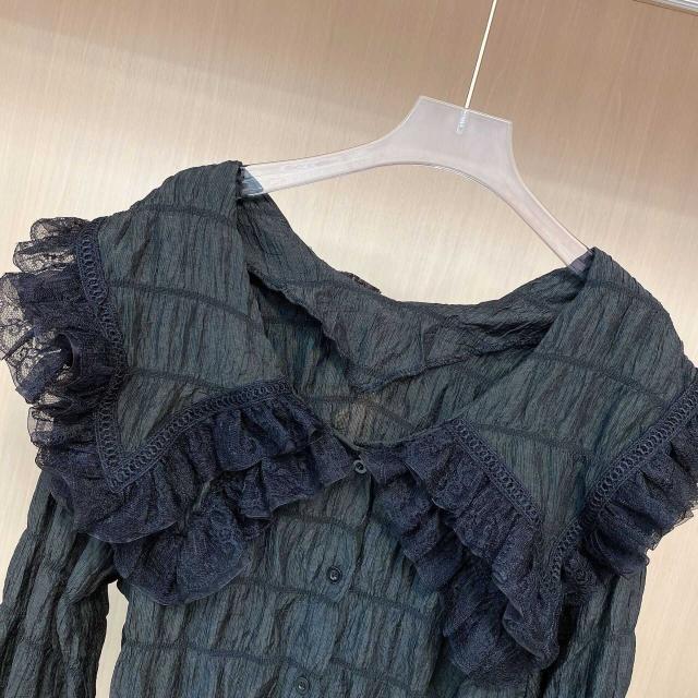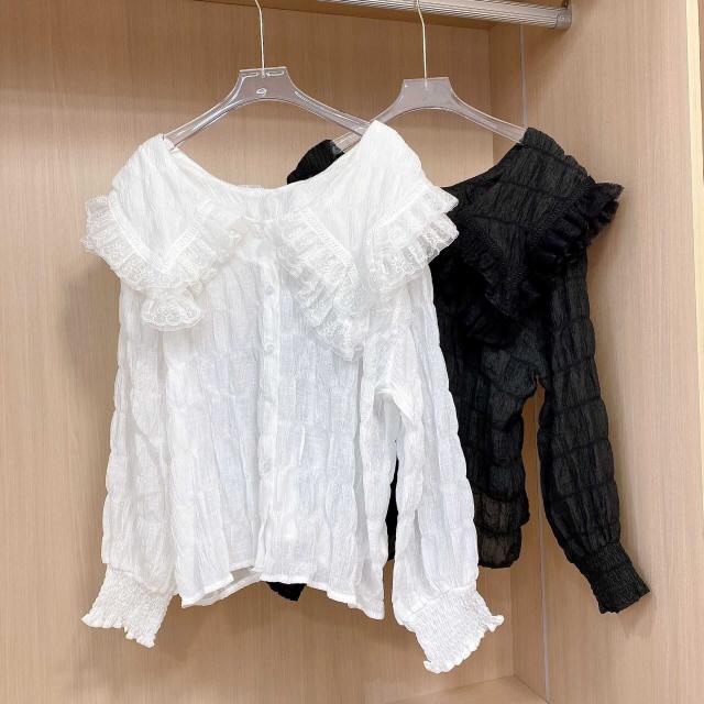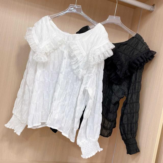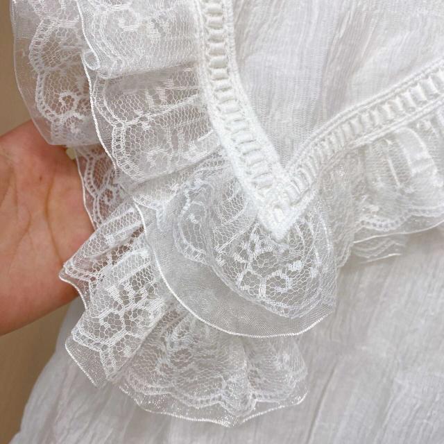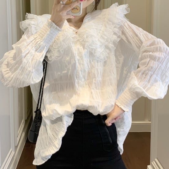 襟元のレースのレイヤード襟が可憐で上品なふんわりブラウスです。