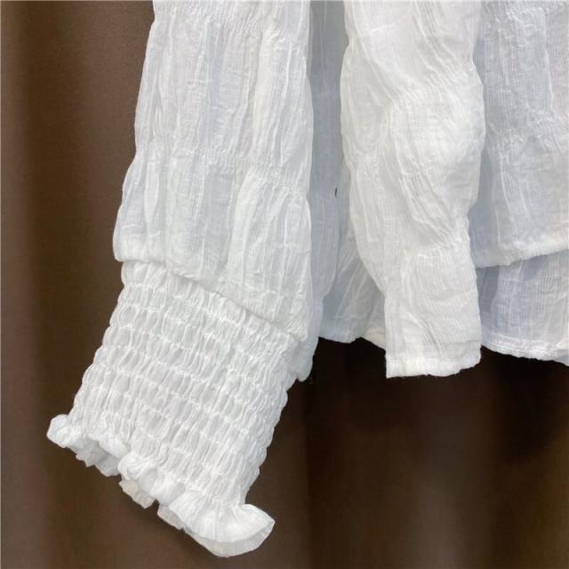 トップス ブラウス 袖あり 長袖 ギャザー デザイン袖 無地 シャーリング Vネック ボリューム 切り替え 透け感 シースルー チュール リボン ショート丈 バブルスリーブ かわいい 大人可愛い