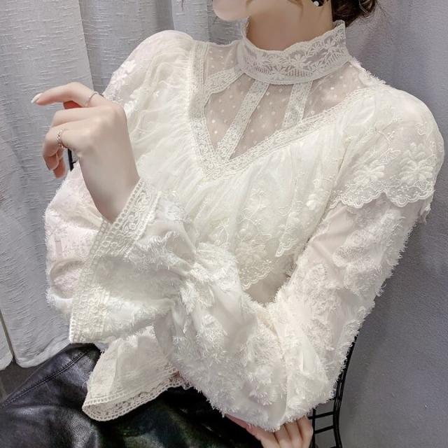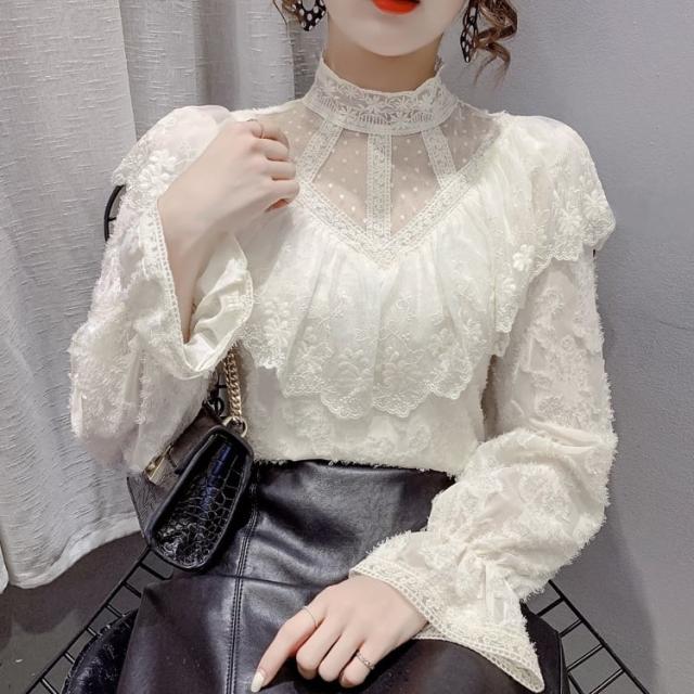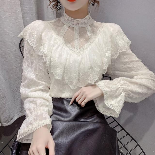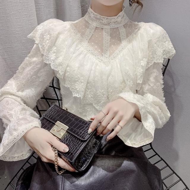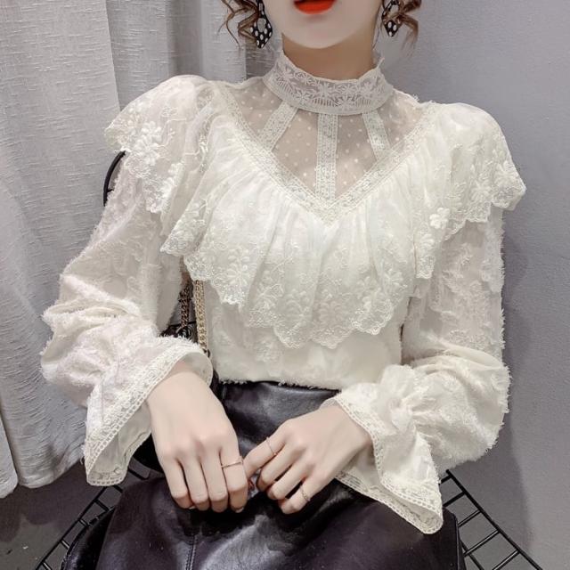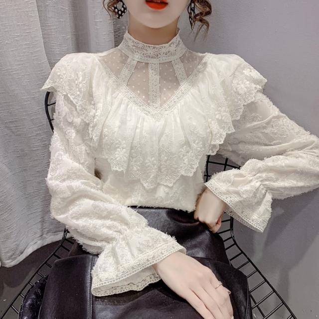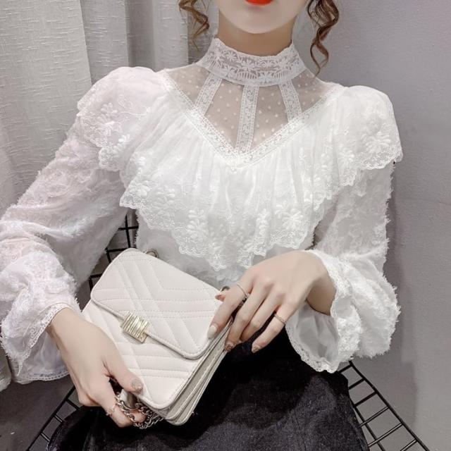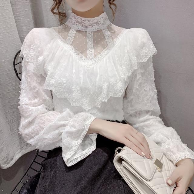花柄総レースの透け感を活かしたタイトなハイネックブラウスです。