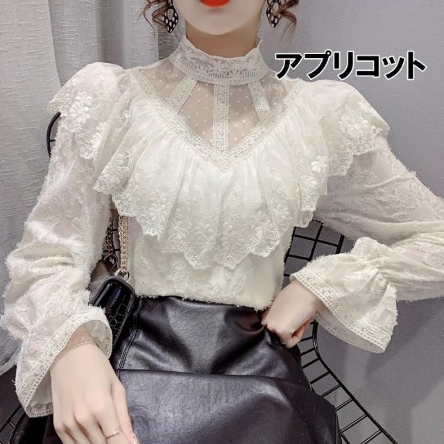トップス ブラウス レディース カットソー 袖あり 長袖 ハイネック 総レース ベルスリーブ 切り替え 花柄 シアー シースルー 透け感 かわいい 大人可愛い シンプル カジュアル 大人