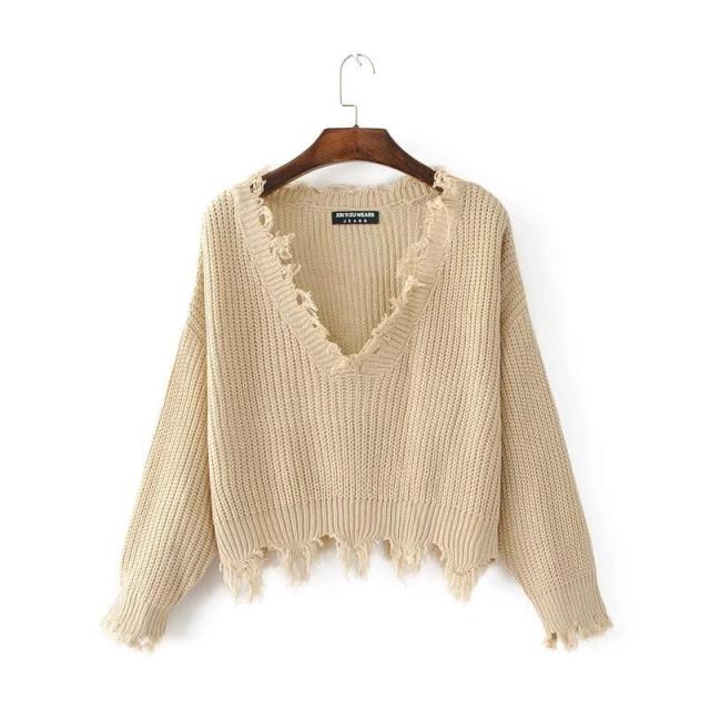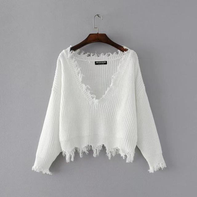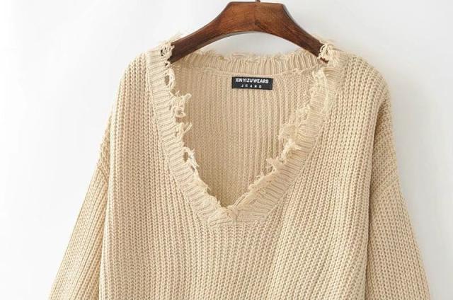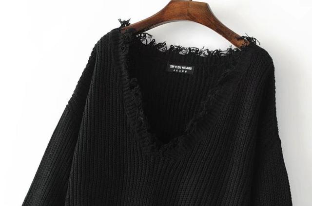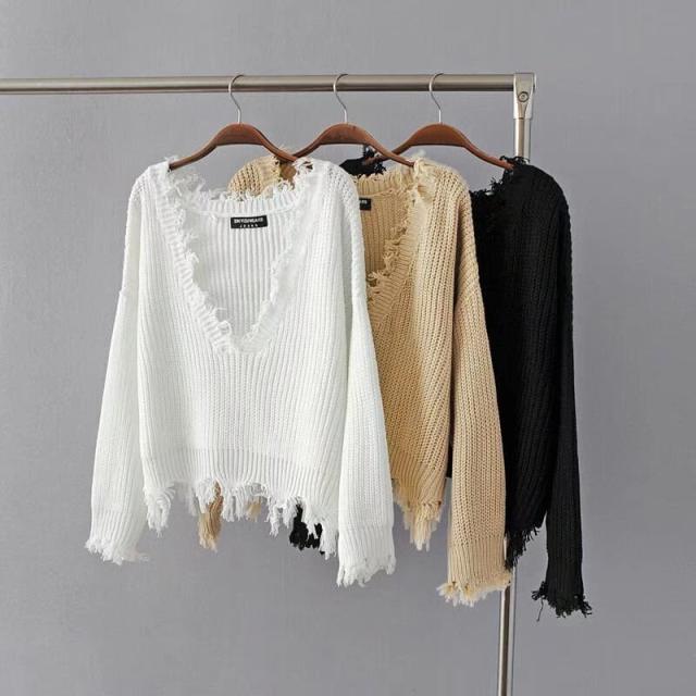 大胆なVネック・カットデザインのフリンジセータートップス