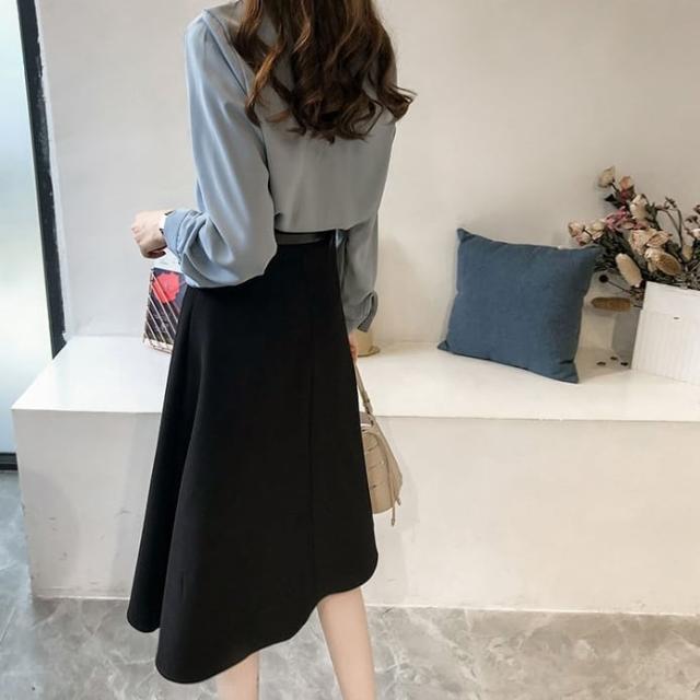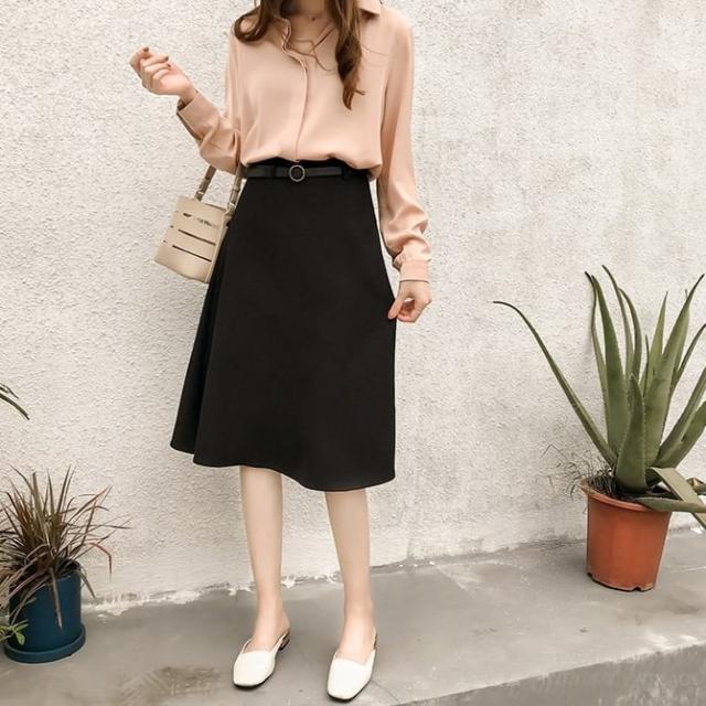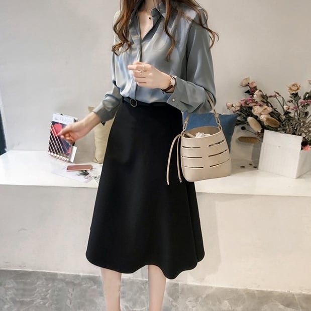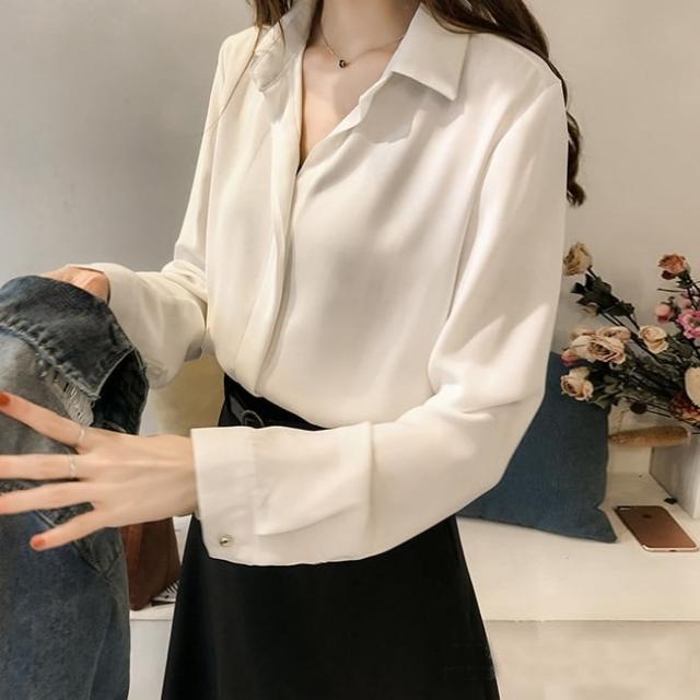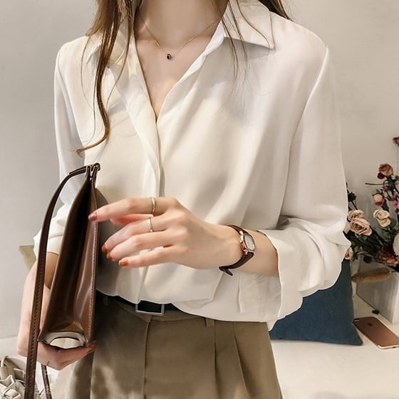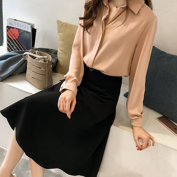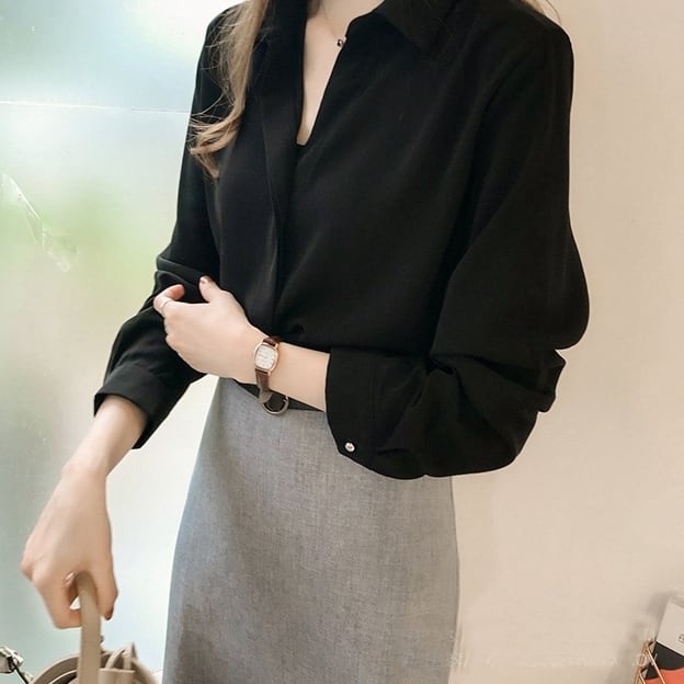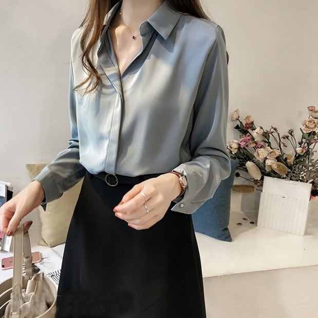 すっきりシックなデザインが魅力のフライフロントブラウスです。