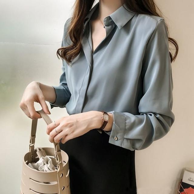 トップス バックボタン 長袖 ブラウス シャツ スタンドカラー フライフロント ニュアンスカラー 無地 とろみ感 ゆったり 人気 おすすめ おしゃれ お洒落 激安 送料無料 可愛い かわいい