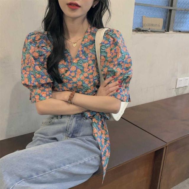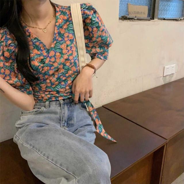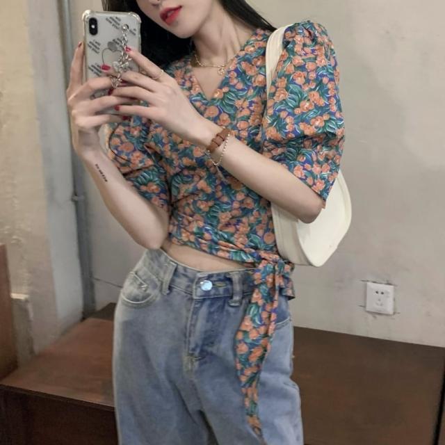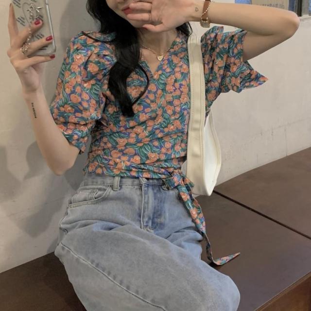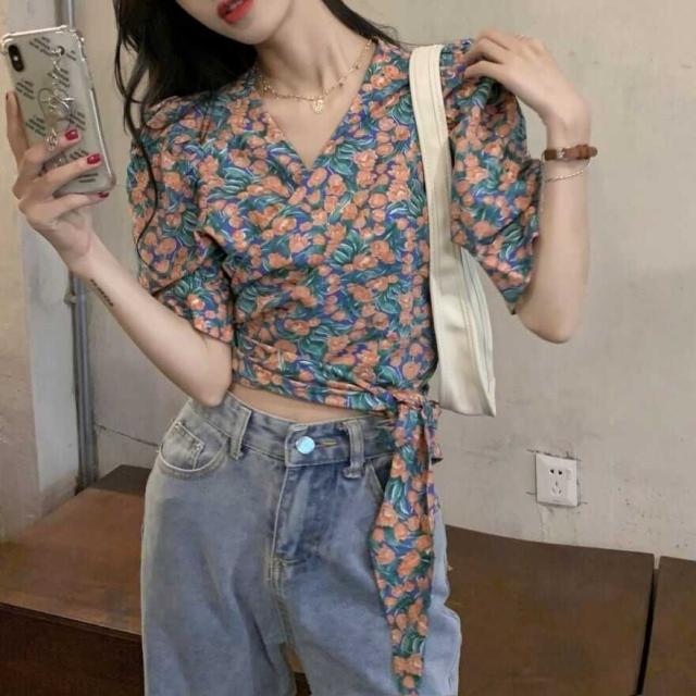 ヴィンテージライクなくすみカラーの花柄がお洒落なカシュクールブラウスです。