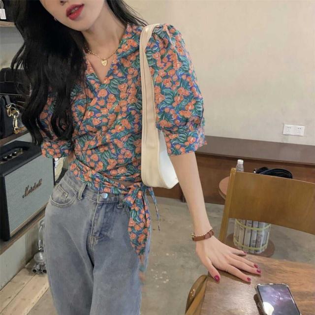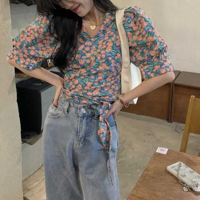 トップス レディース シャツ ブラウス 袖あり 半袖 五分袖 襟なし フリル ギャザー 花柄 ウエストマーク ハイウエスト カシュクール Vネック 大人可愛い きれいめ シンプル カジュアル 大人