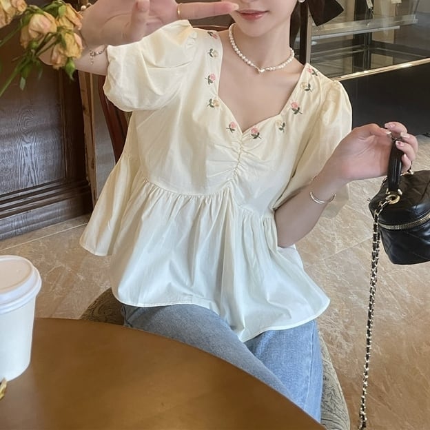 バストにギャザーをあしらって花柄刺繍を散りばめたブラウスです。