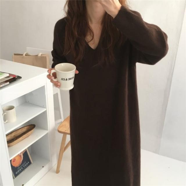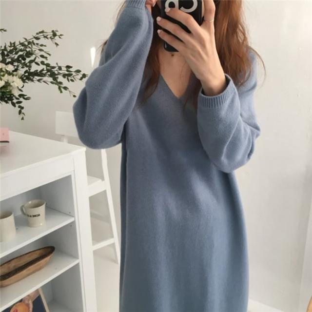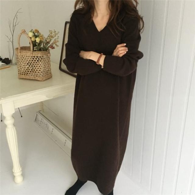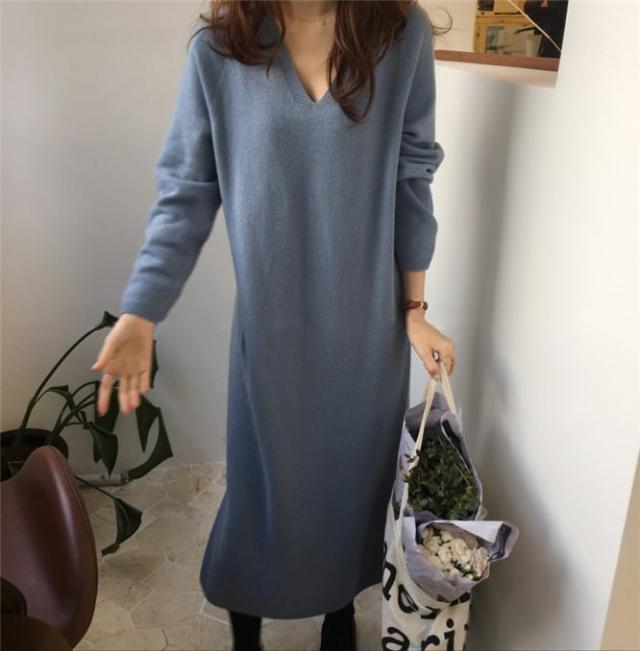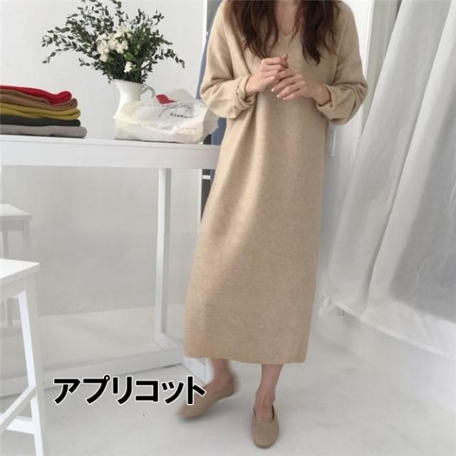 ワンピース ニット ミモレ丈 ロング 長袖 おしゃれ お洒落 送料無料 プチプラ シャツ 長袖 タイト スリム Vネック 無地 ポリエステル ワイド ウエスト ビッグシルエット 着痩せ 襟付き