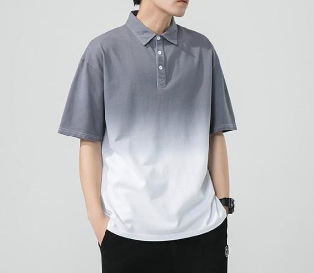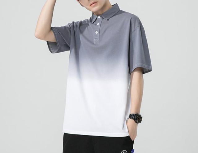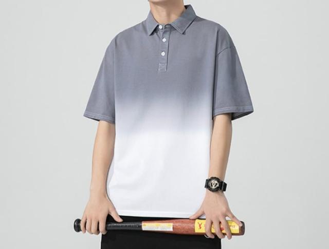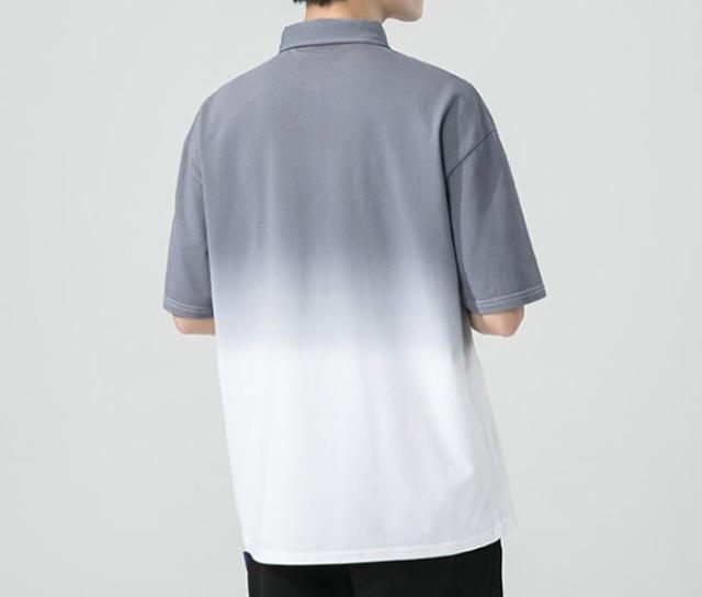 落ち着いた色合いのグラデーションカラーが着映えする半袖ポロシャツ。