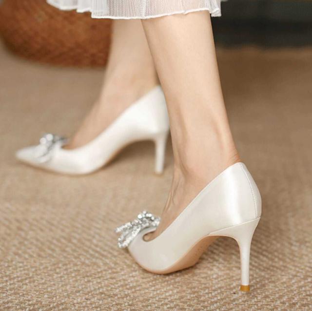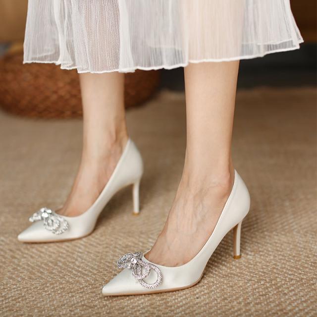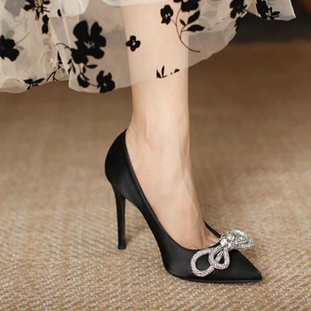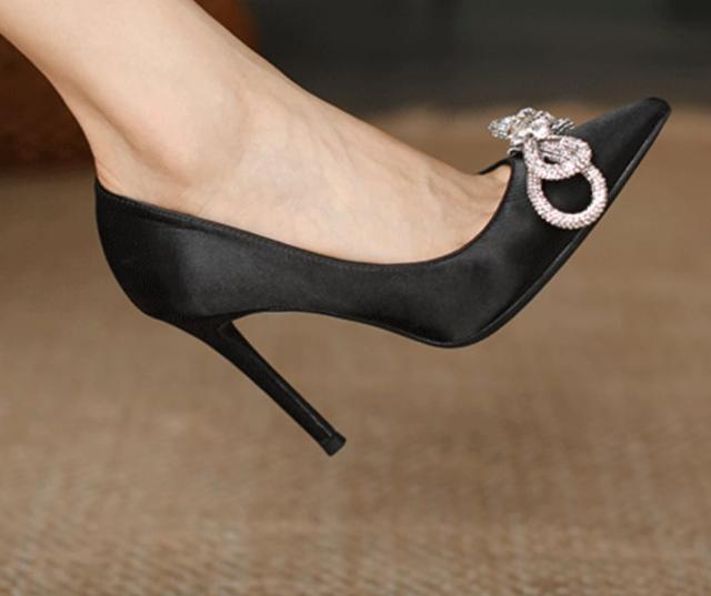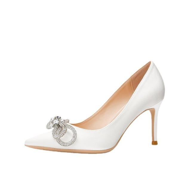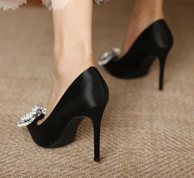 サテン生地ときらきらなリボンがエレガントなポインテッドトゥハイヒールパンプス。