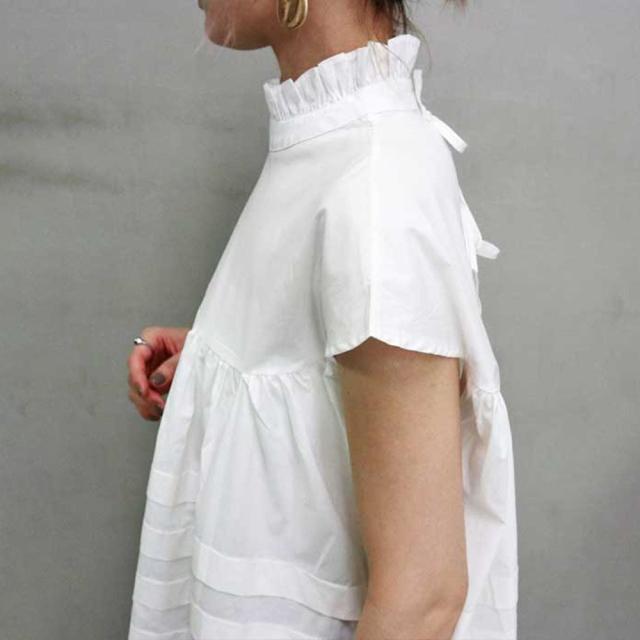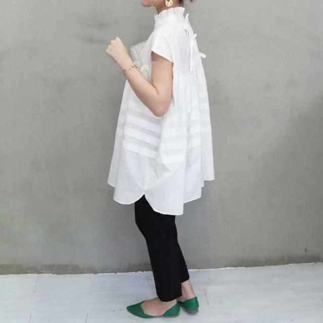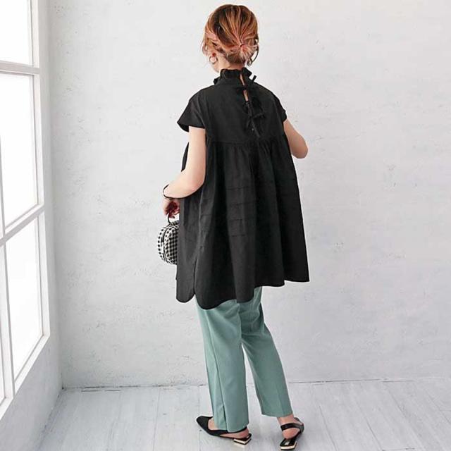 トップス ブラウス Tシャツ 切り替え 袖あり 半袖 フレア タックフリル ギャザー ハイネック バックコンシャス リボン 切り替えデザイン かわいい 大人可愛い きれいめ シンプル