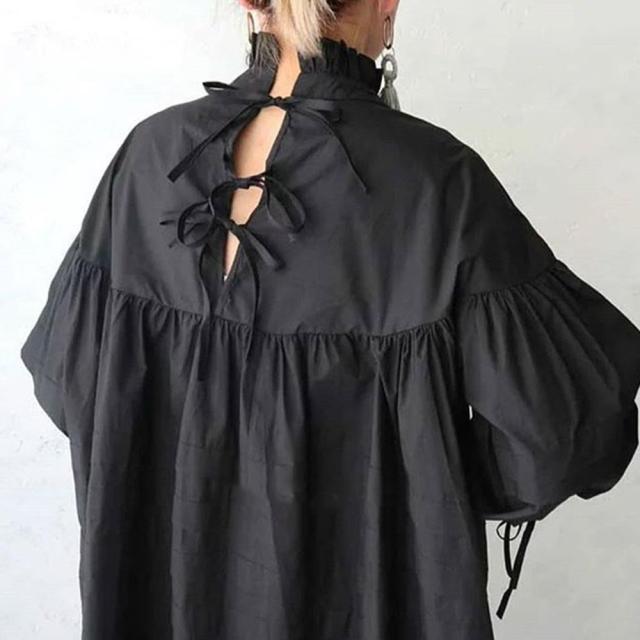 バックのリボン付きの深めスリットがセクシーなスタンドカラーブラウスです。