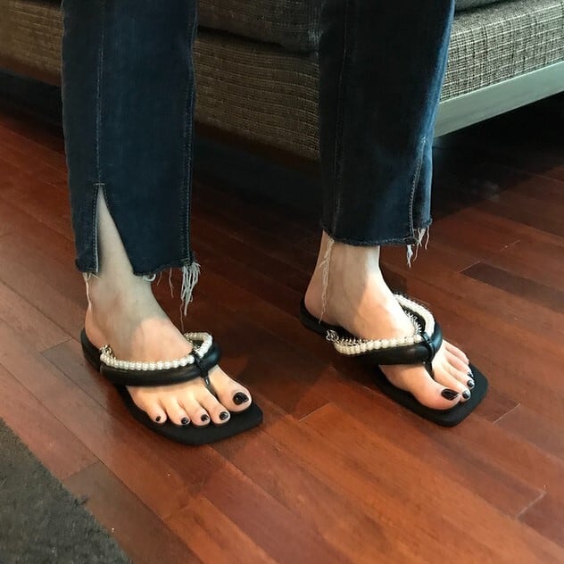 丸みのある大きめのストラップにパールチェーンがアクセントになったトングサンダル。