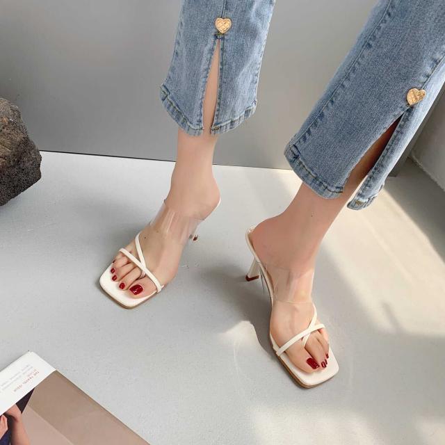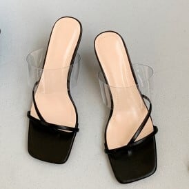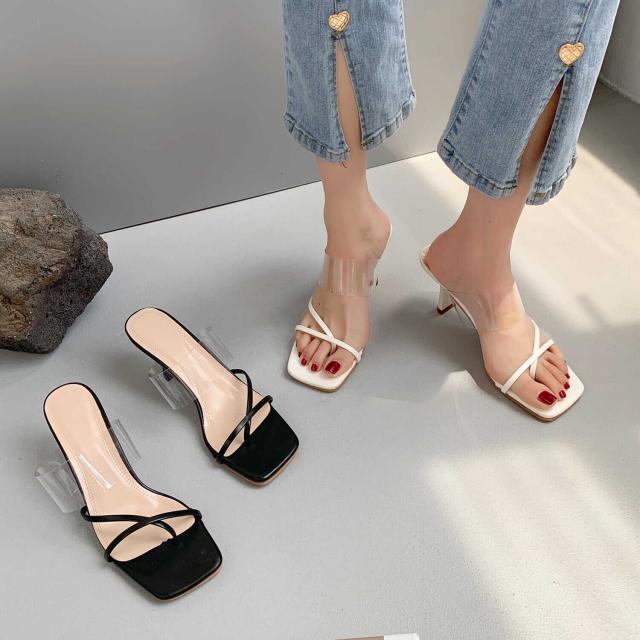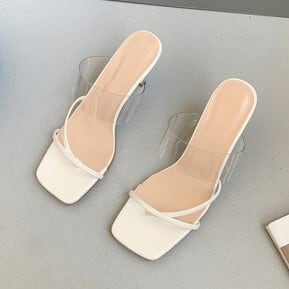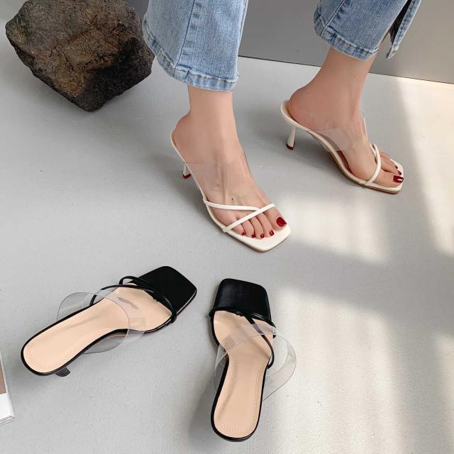 華奢なストラップとクリアストラップが付いた個性的でありながら安定感のあるヒールサンダル。